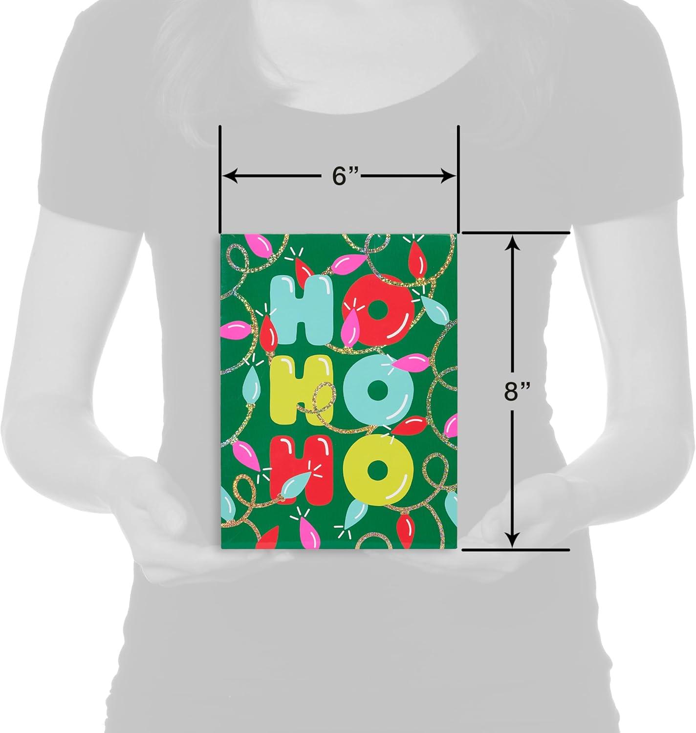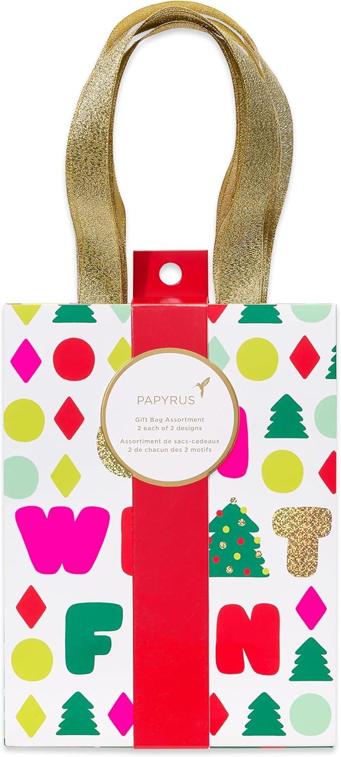 Add style to the holidays and watch their face light up with this premium Christmas gift bag from Papyrus! Measuring 11 3/8” x 11 3/8” x 6″, this large gift bag features festive lettering in bright pink, green, and turquoise blue on vivid red, with colorful holly and decorative starburst accents! Shimmering metallic foil, sequin flowers, twinkling gems, and double-sided satin and metallic and grosgrain ribbon handles bring even more sparkle to this impactful bag design! Make your gift presentation more gorgeous with Papyrus tissue paper (sold separately) to fluff or fold for the perfect finishing touch. Large gift bags from Papyrus are perfect for wrapping special gifts like clothing, home decor items, toys, stuffed animals, multiple books, electronics and other hard-to-wrap presents. Crafted with the finest materials, Papyrus gift bags are sure to enhance your gift presentations in unique ways!