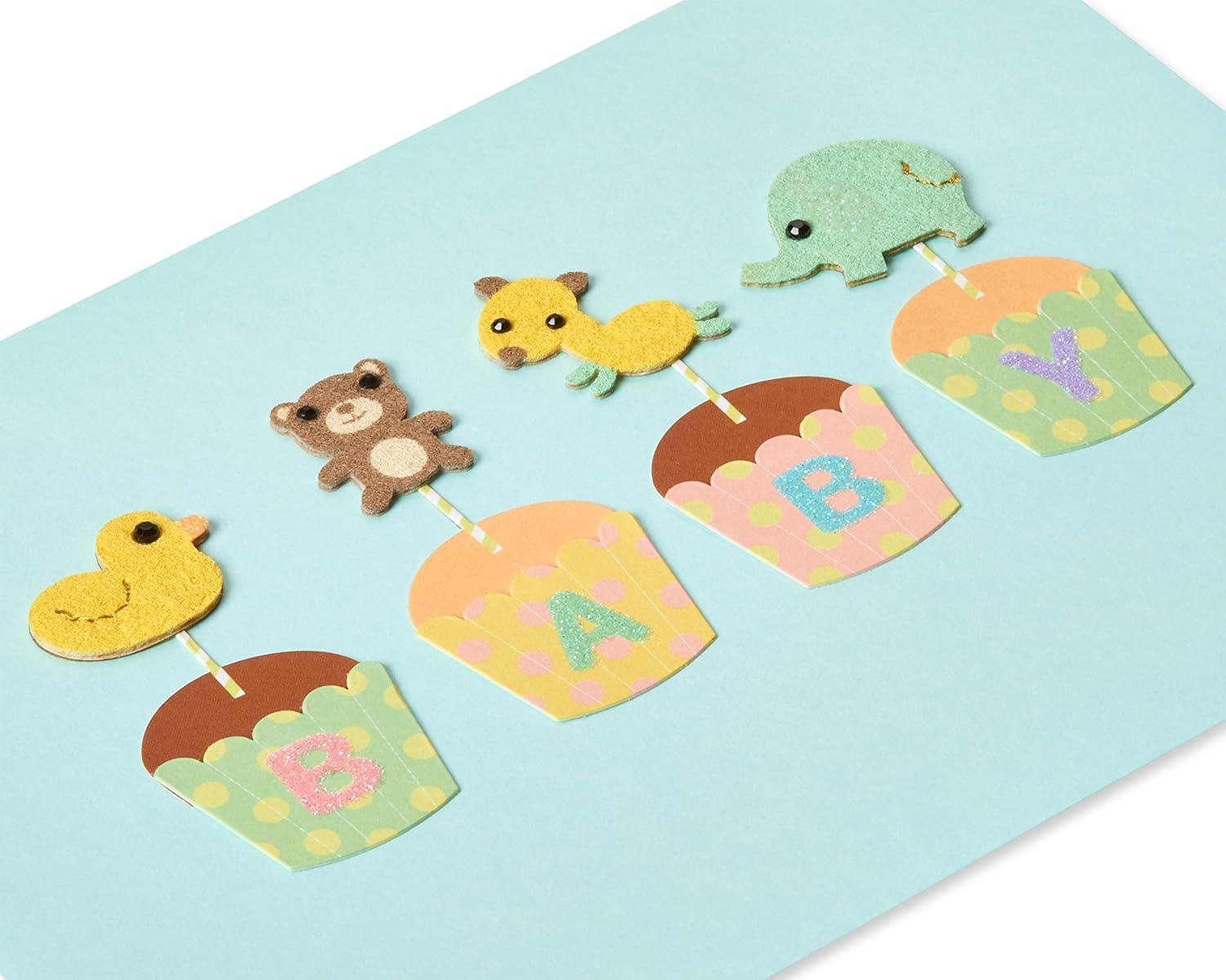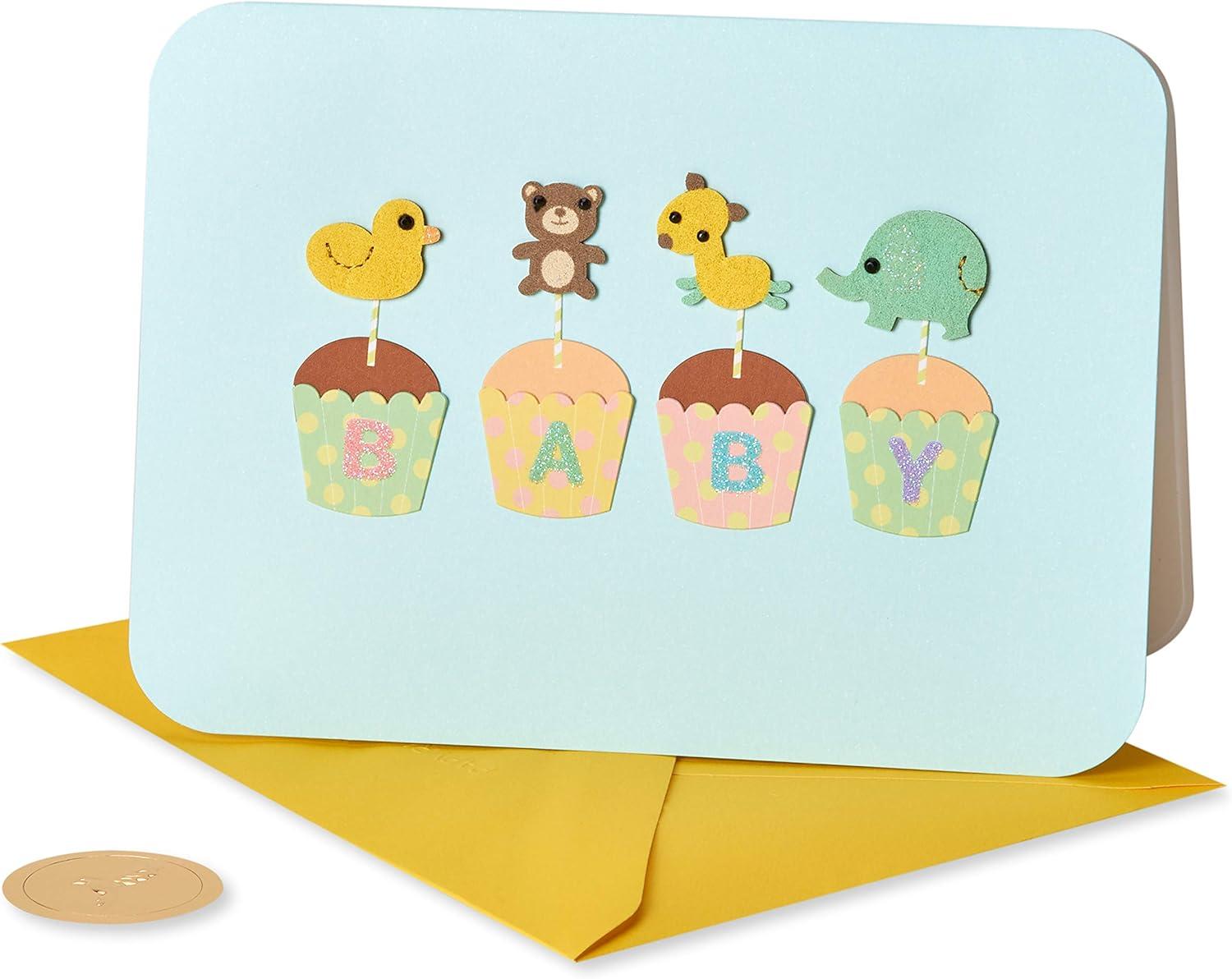 Shower them with happiness with a baby card from Papyrus! This handmade baby shower card features felt attachments, beads, and stitching for a one-of-a-kind keepsake a parent will treasure. Cute cupcakes with animal toppers spell out “baby” on the outside of the card, while a wish for love on the inside leaves room for you to write a personalized message. Complete with a yellow envelope and iconic Papyrus gold foil seal, this card will make any soon-to-be parent’s day! Extra postage is required.