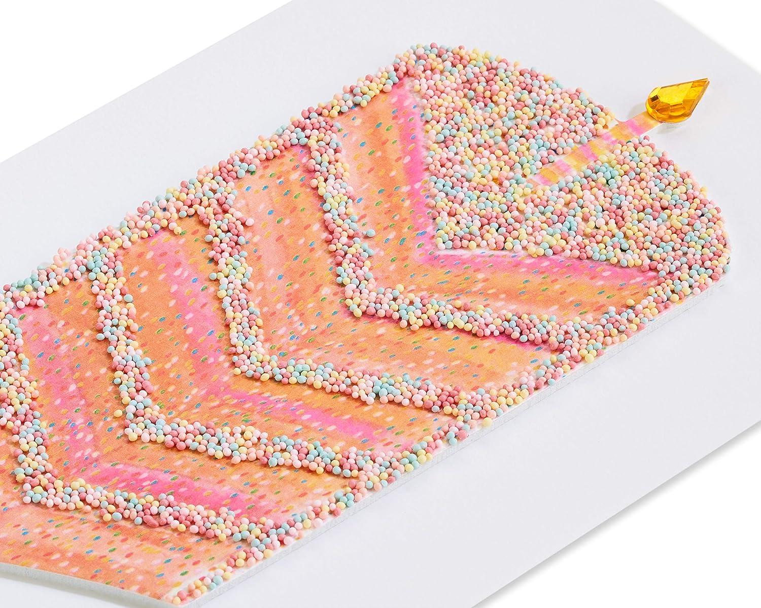 Make them feel 10 feet tall on their birthday with this premium card from Papyrus! Perfect for family, friends, coworkers, or anyone who just gets sweeter with age. Featuring a towering slice of scrumptious cake, this card is deliciously decorated with foil, micro-beads, and layered paper. Cake topper is a birthday candle tipped with a gem! The playful inside message serves up extra fun and happiness for that special someone in your life. Premium yellow-gold envelope with sprinkle-patterned lining and unique Papyrus gold seal included. Extra postage required.