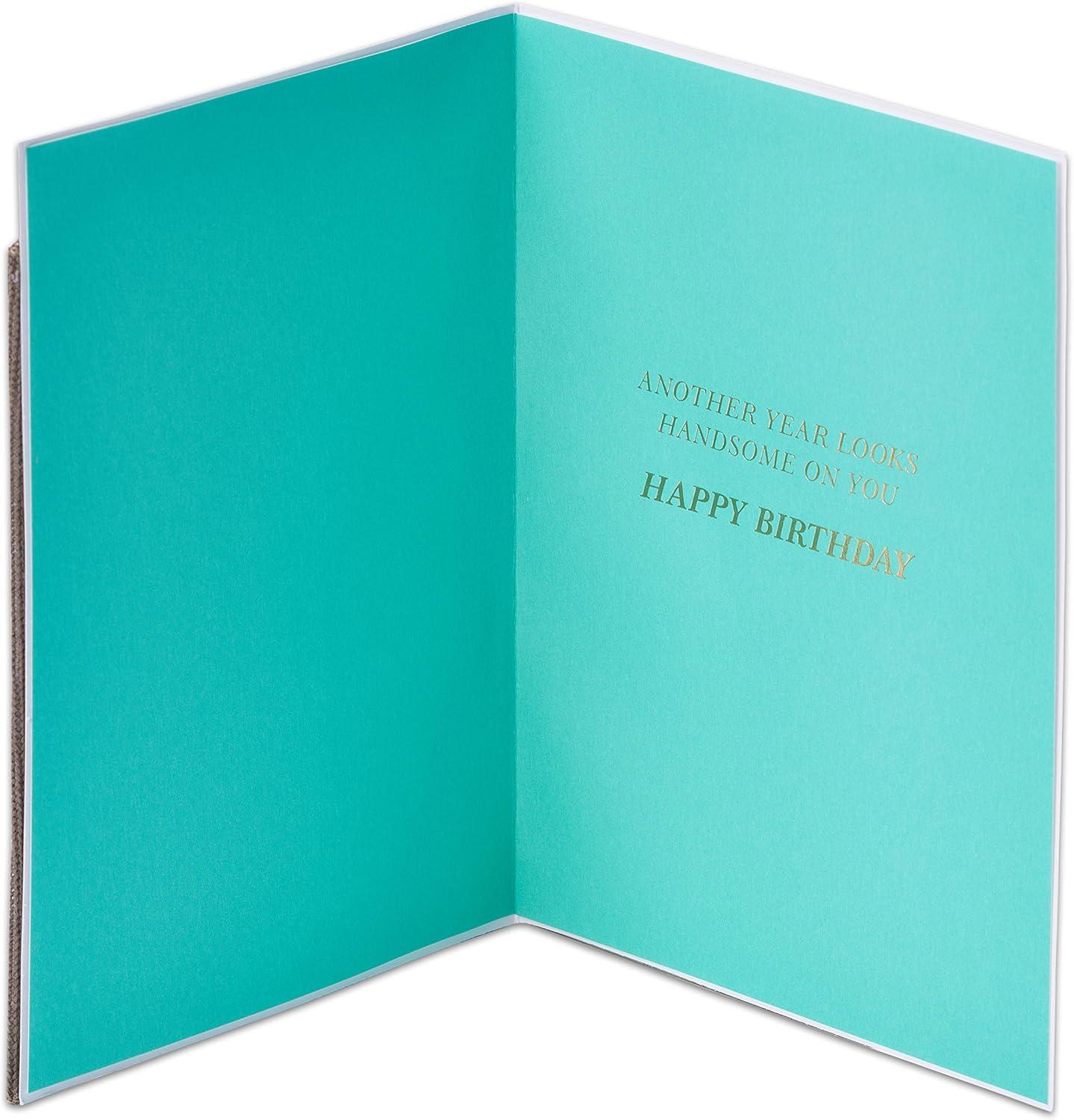 Make his birthday spectacular with this premium card from Papyrus The bold masculine design is intricately cut with a laser — perfect for the man who appreciates the finer things in life. Dramatic color palette in blue, green, and black is embellished with metallic silver foil. This is a card that truly impresses. Inside message adds a warm wish to make his day. Includes bright blue envelope with silver lining and the unique Papyrus gold seal.