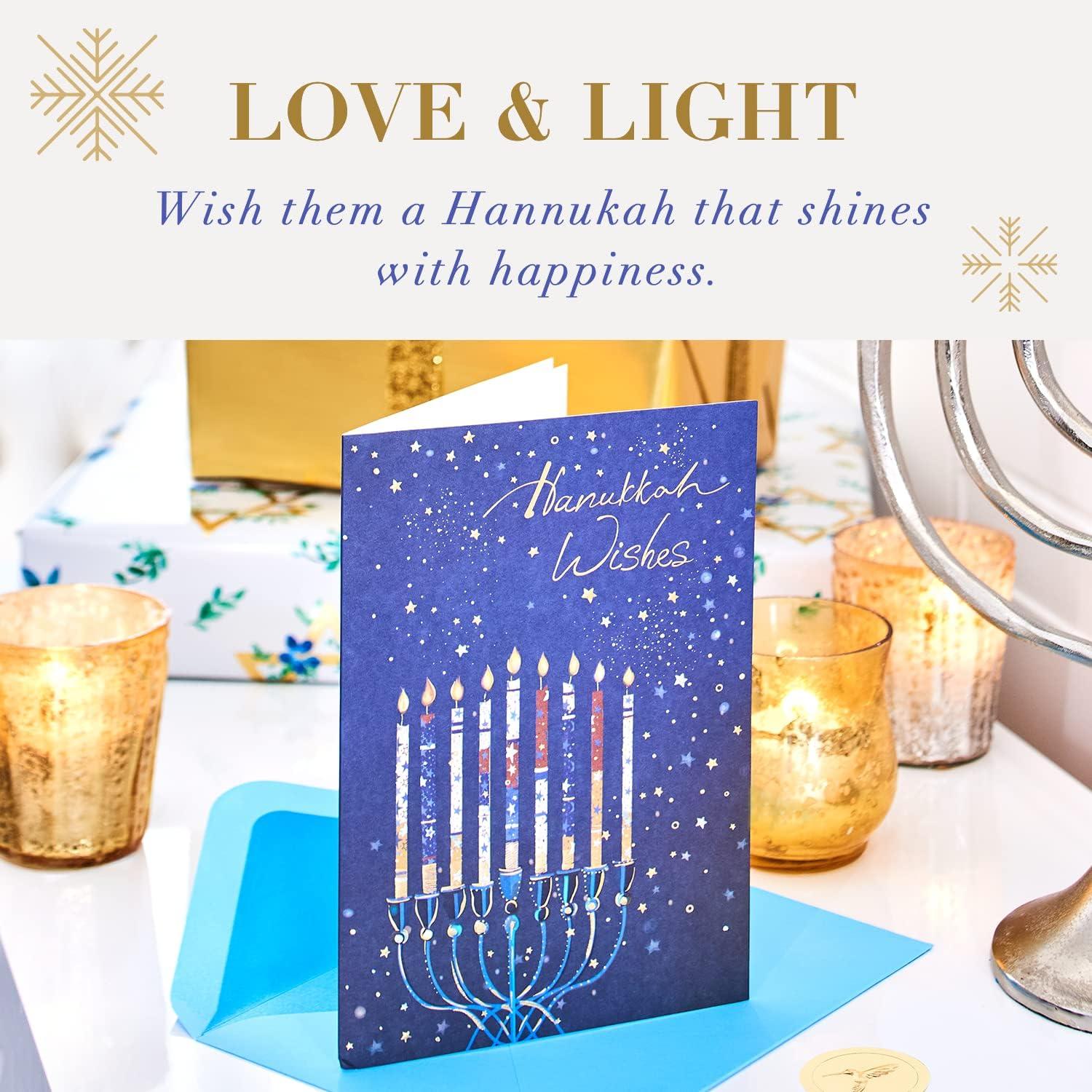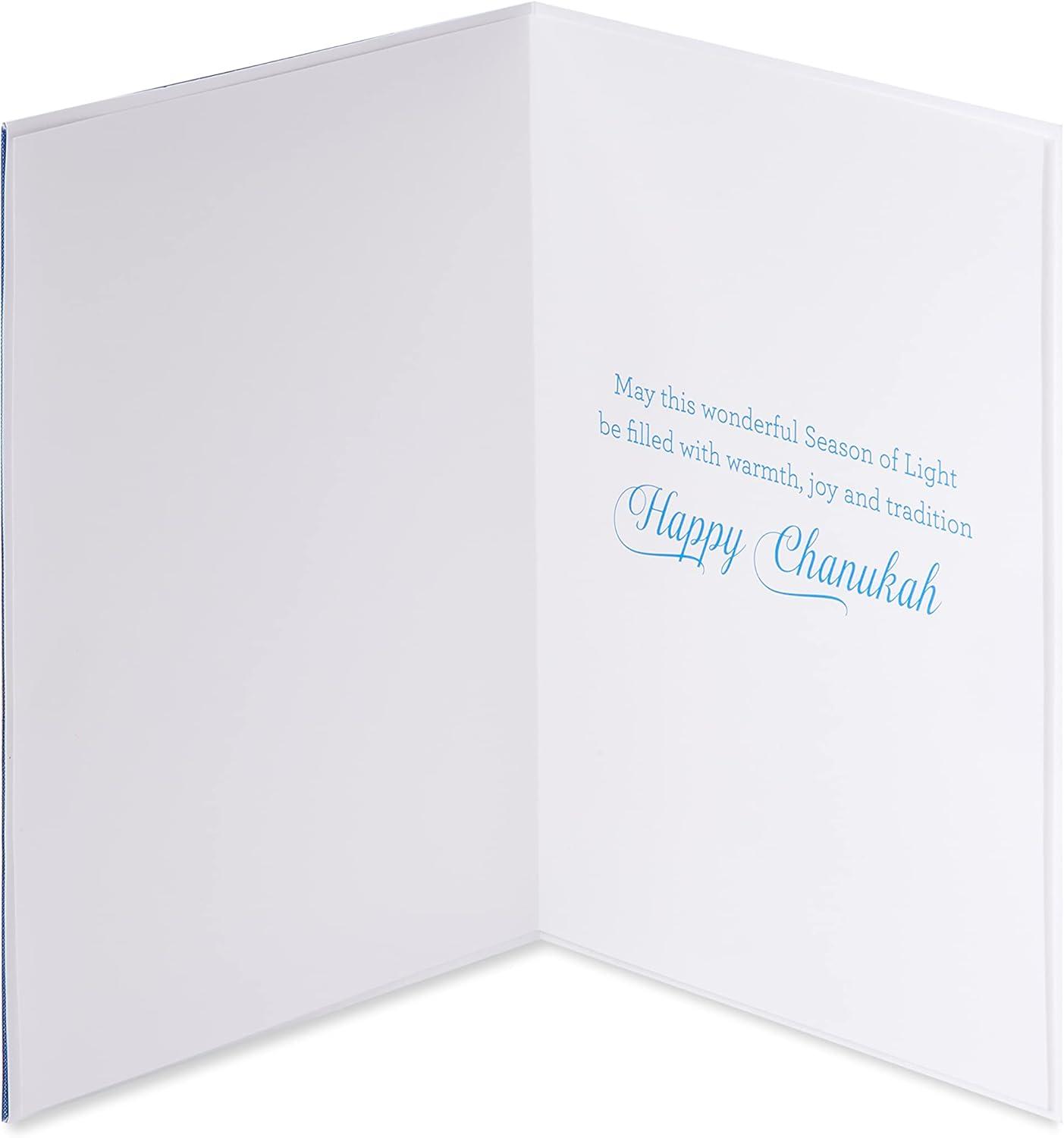 Nothing says Happy Chanukah like an elegant Chanukah card from Papyrus. This sophisticated card features a blue menorah on a dark blue background with bright, yellow gems as the candle lights. Inside, a simple wish for a wonderful Season of Light. It’s the kind of card you can give to so many people. Give it to a friend, co-worker, neighbor, sibling, in-law, any other distant or close relative. They’ll absolutely love it. Includes envelope and gold foil Papyrus seal.