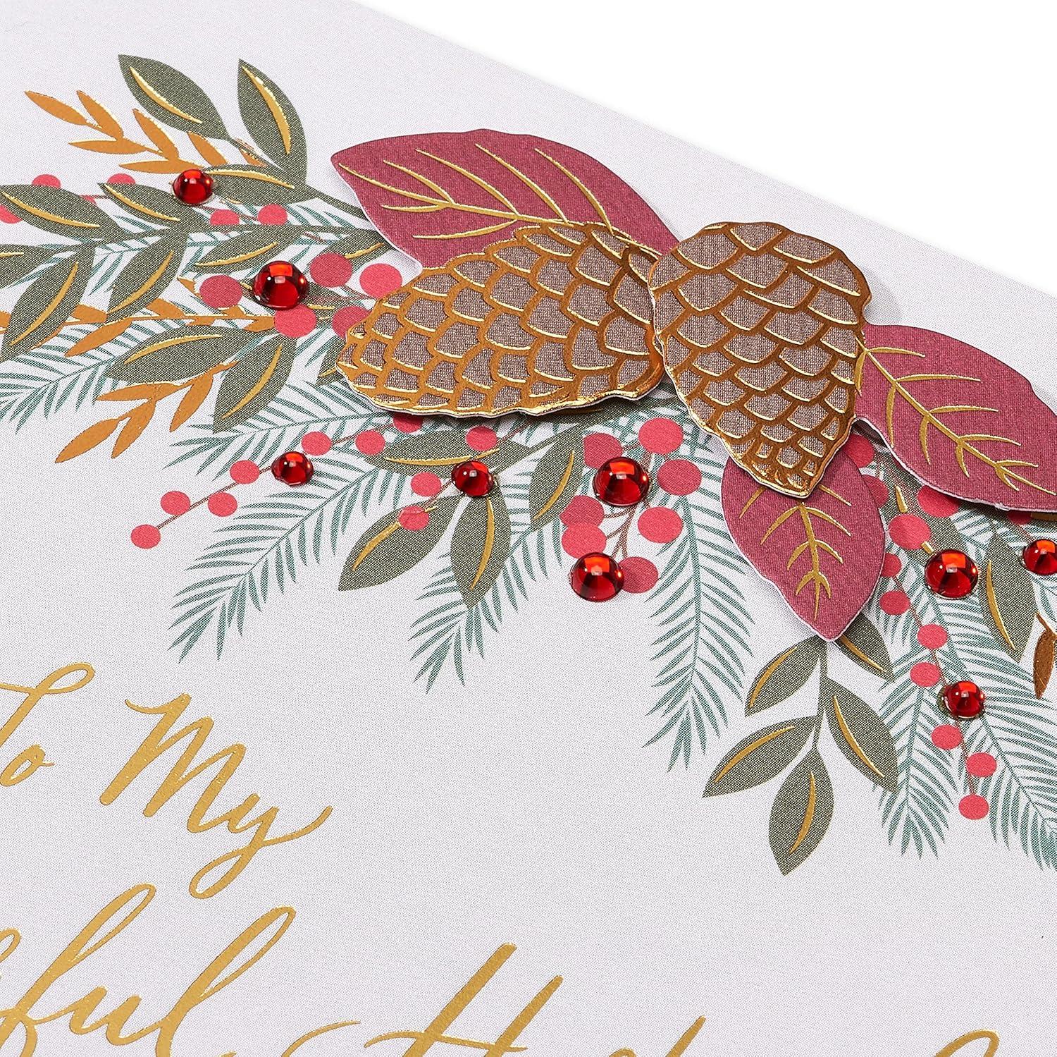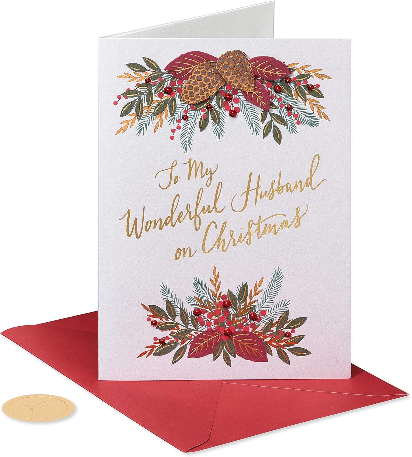 Let your husband know how much you care with a premium Christmas card exclusively from Papyrus. This sophisticated card features a beautiful pinecone Christmas bough with the words “To My Wonderful Husband on Christmas” and metallic gold foil, sparkling gems, and layered paper attachments embellishments. Inside, there’s a warm and loving message that is sure to leave a lasting impression and plenty of room to add your own personalized note. Premium envelope with unique Papyrus gold seal included. Extra postage may be required. Only from Papyrus.