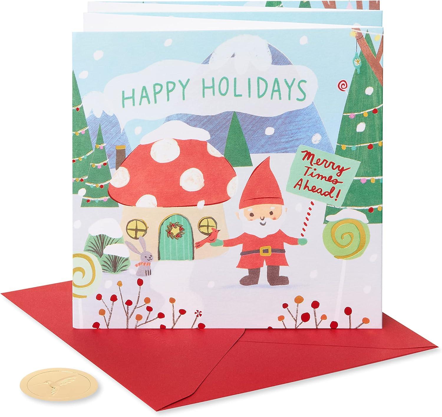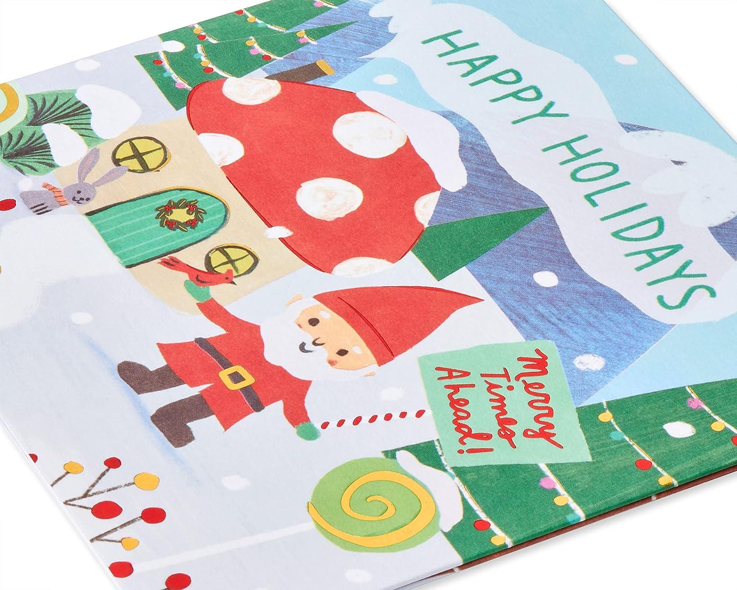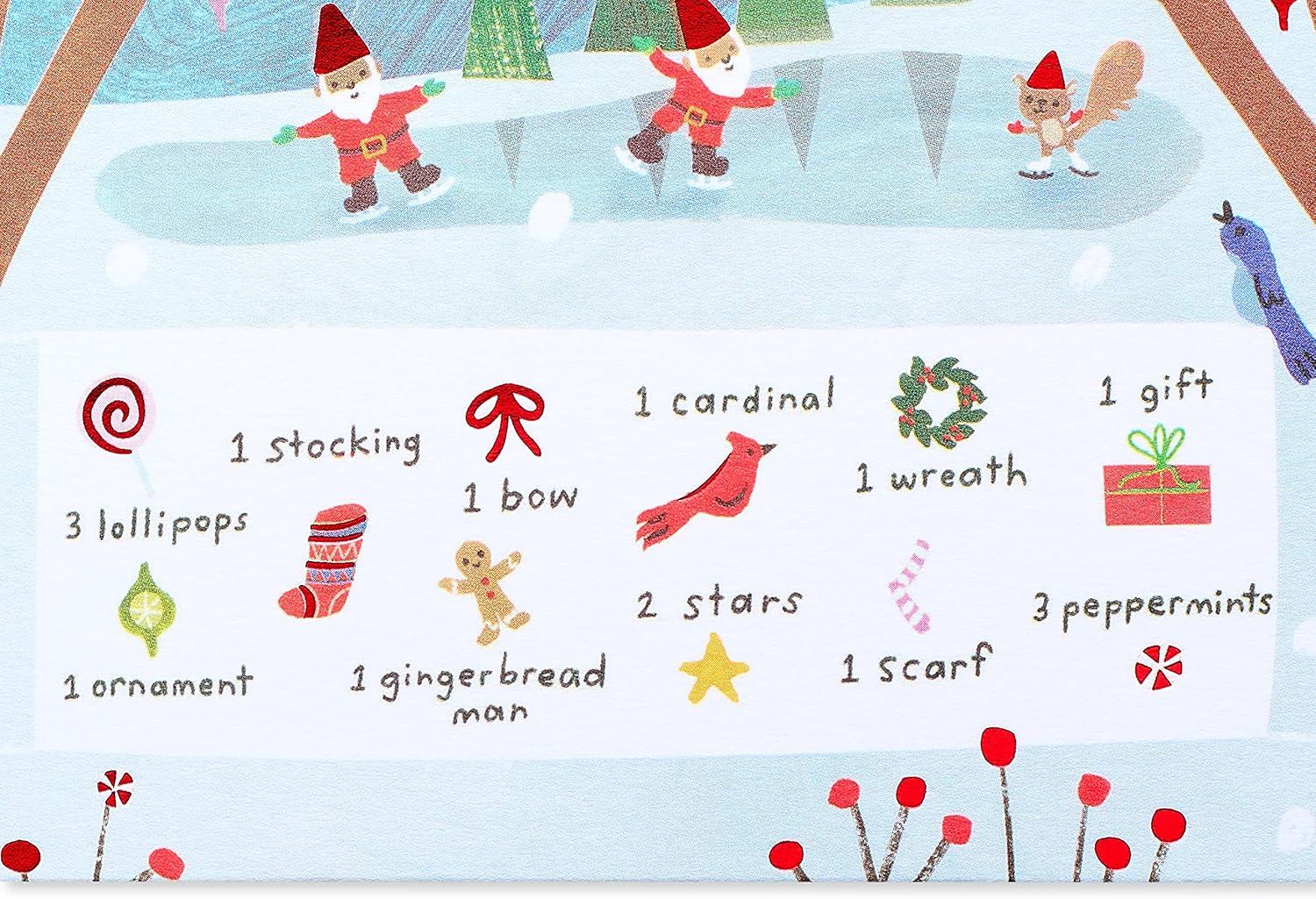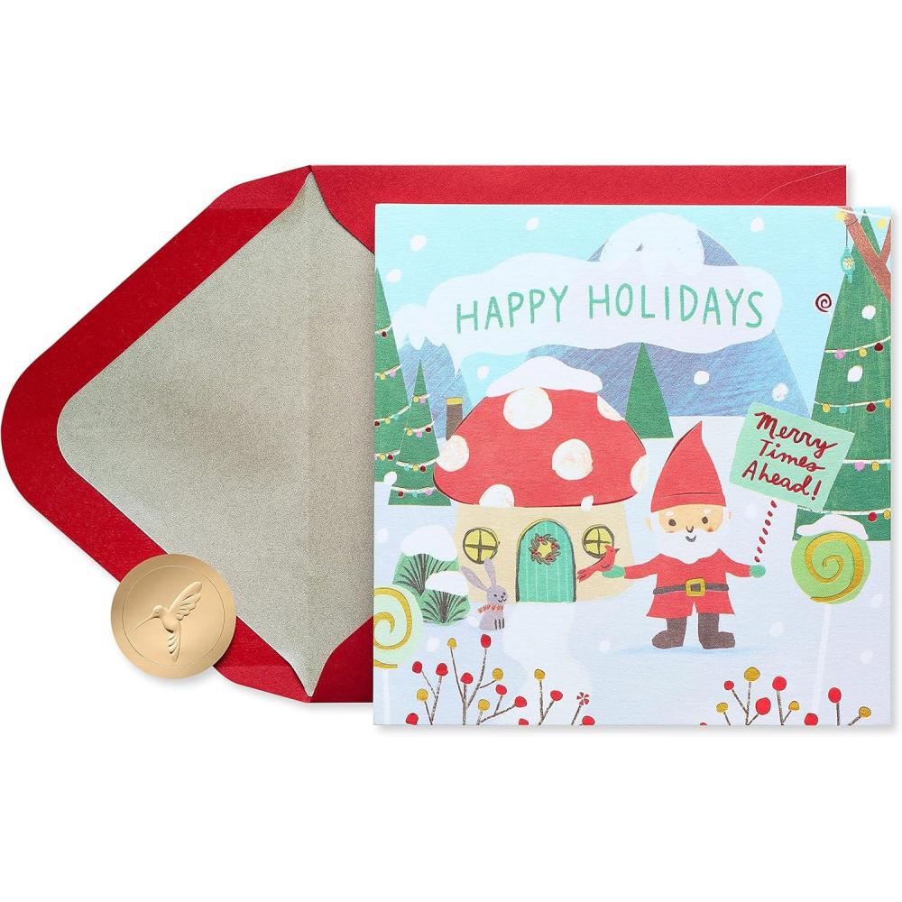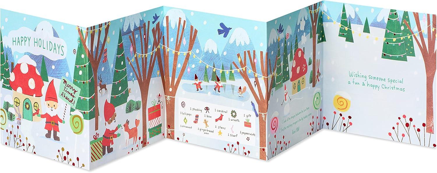 Make any child’s Christmas merrier with this magical seek-and-find Christmas card from Papyrus! This premium 5-panel design will capture every kid’s imagination. Friendly forest gnomes have festively decorated their woodland home for Christmas in bright holiday colors embellished with metallic red and gold foil and embossing. Now the gnomes are inviting the child to do a fun holiday activity! Unique items to seek and find include a gingerbread man, cardinal, scarf, ornament, and more. Warm wish inside is perfect for every child, like son, daughter, grandson, granddaughter, niece, nephew, and every kid. Make their holidays extra merry with this premium Christmas card, only from Papyrus. Includes red envelope and unique Papyrus gold seal.