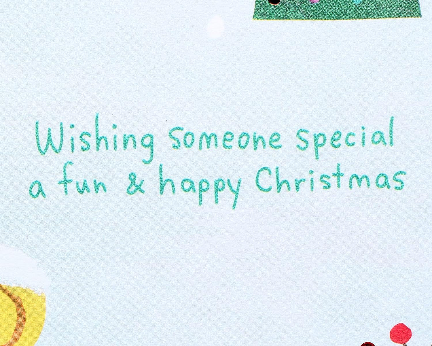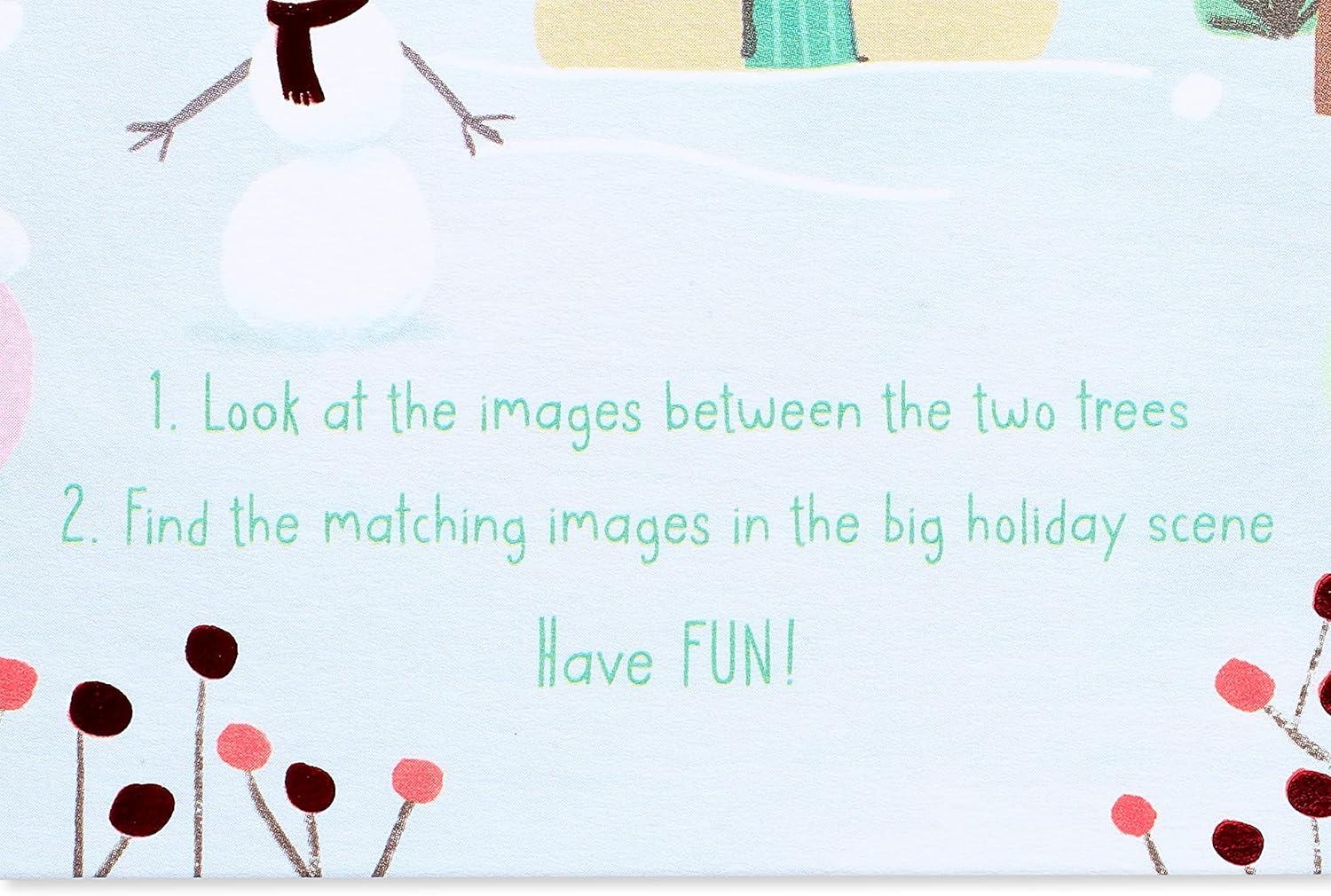 Inside Message: Wishing someone special a fun & happy Christmas. 1. Look at the images between the two trees 2. Find the matching images in the big holiday scene Have Fun