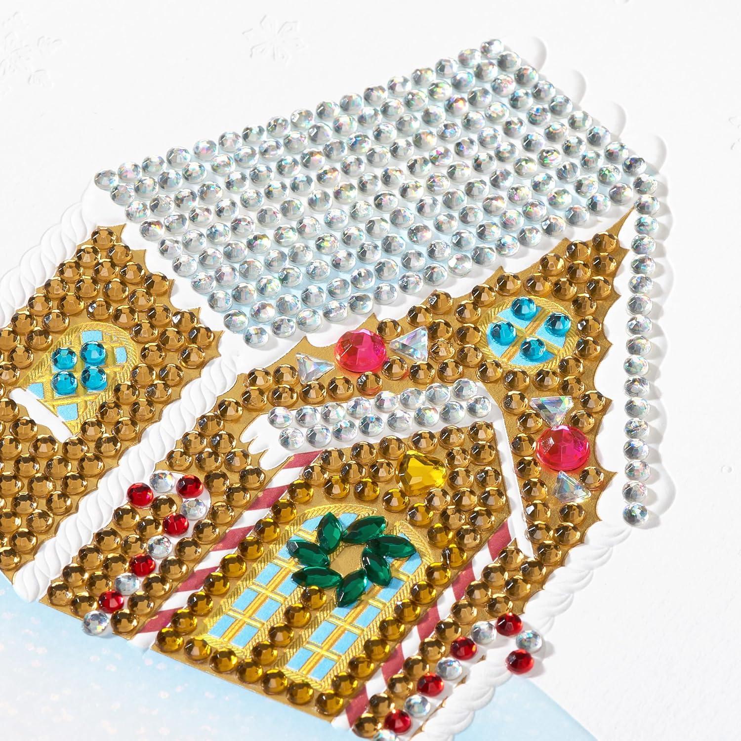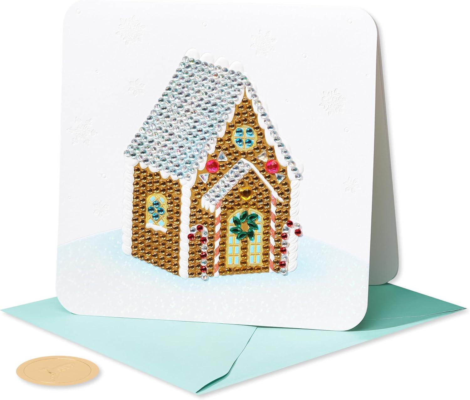 This handmade Papyrus Christmas card features shimmering foils, bows, sparkling gems, and unique attachments