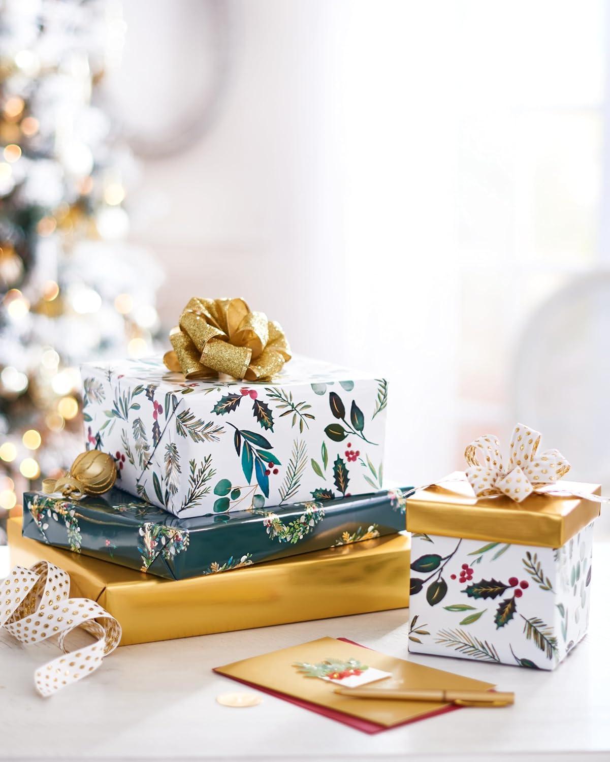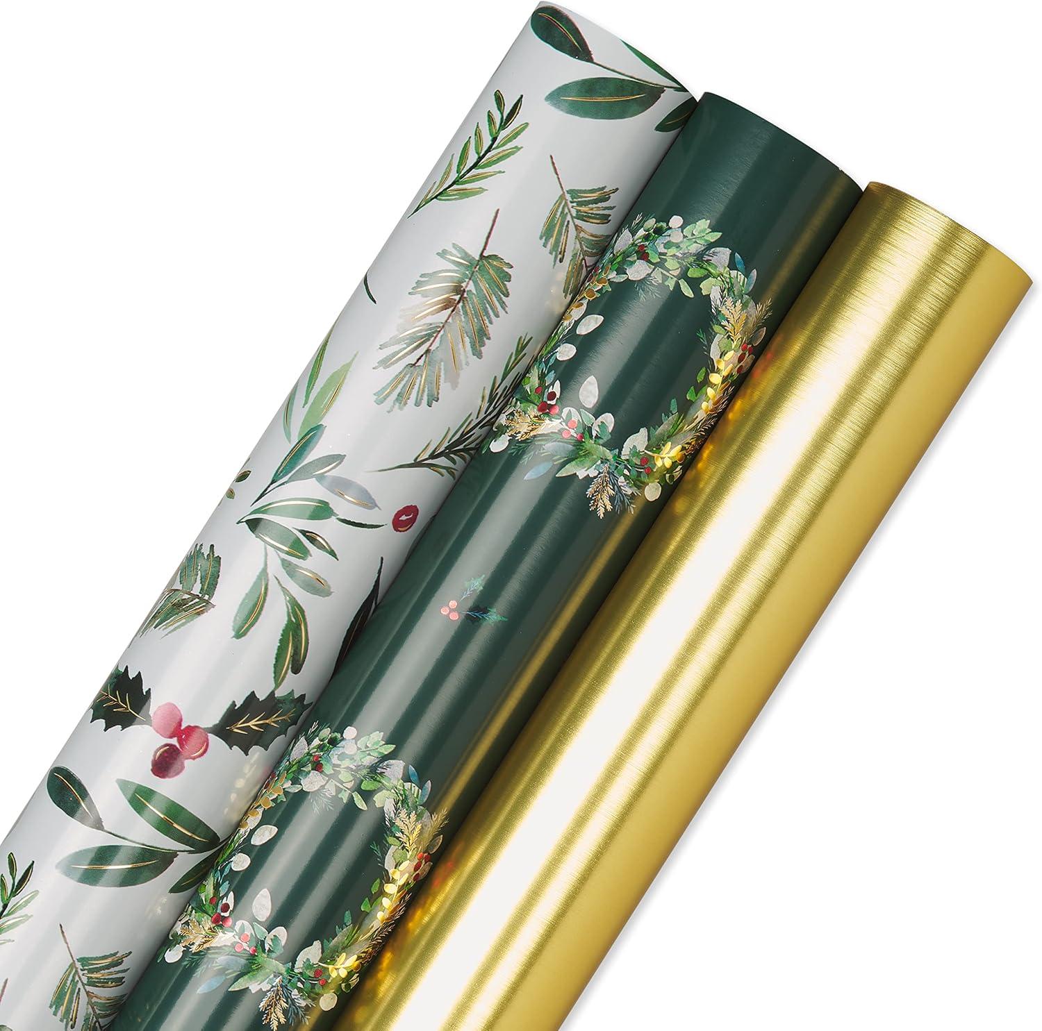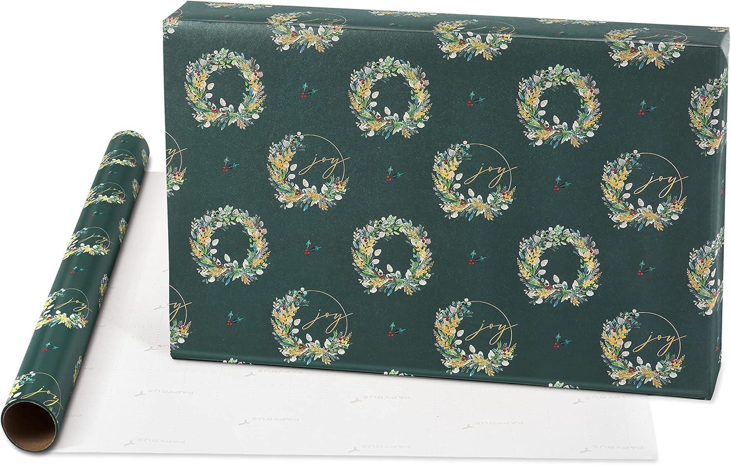 Papyrus Christmas Wrapping Paper Rolls, Teal with Gold Stars, Christmas Text (3 Rolls, 67.5 sq. ft.)(Holly Wreath Gold)