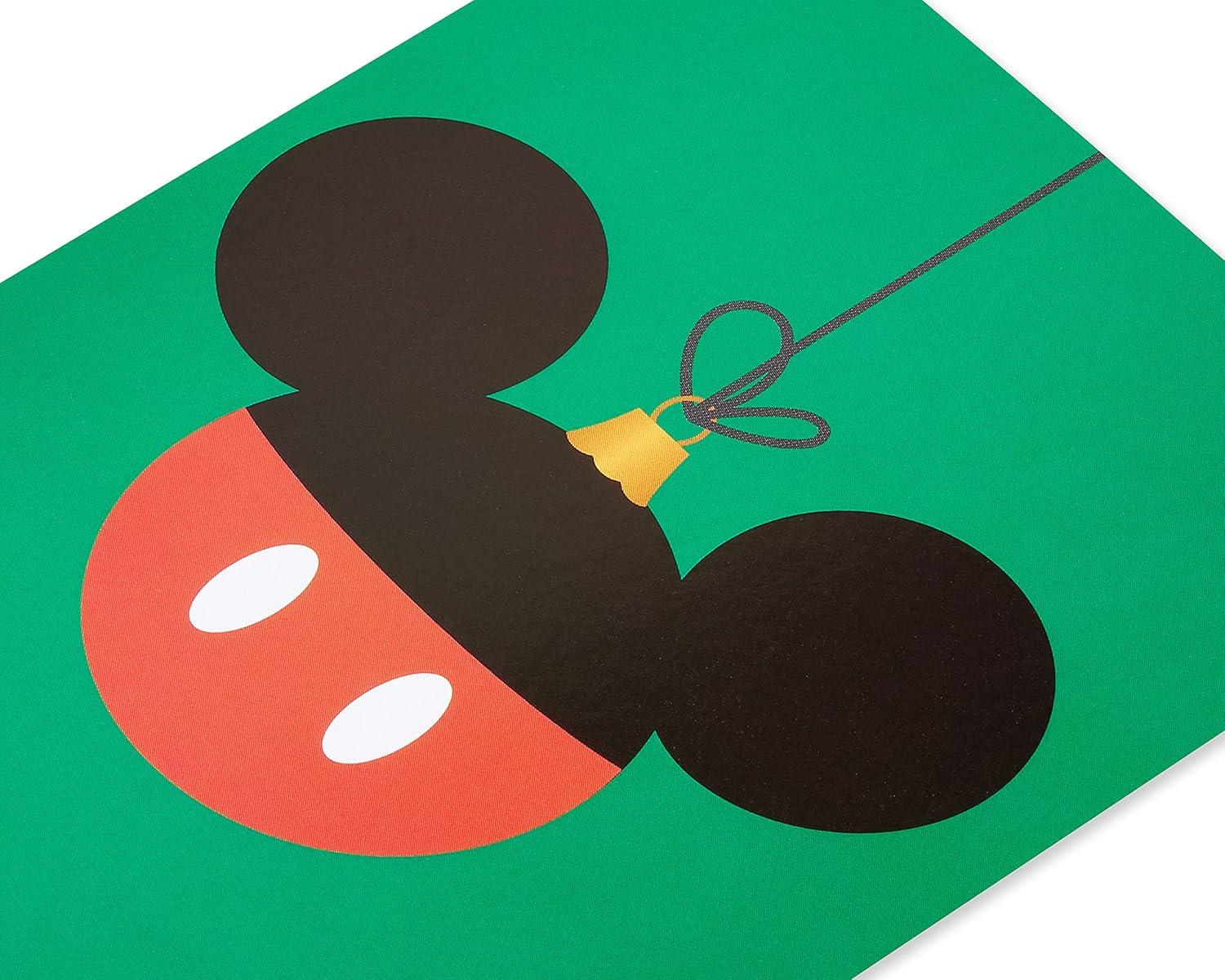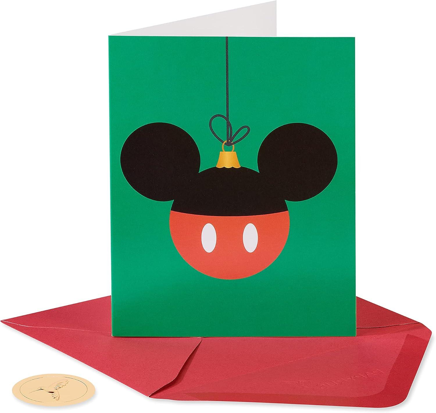 This classic Christmas card by Papyrus is glitter-free and features a Mickey Mouse ornament