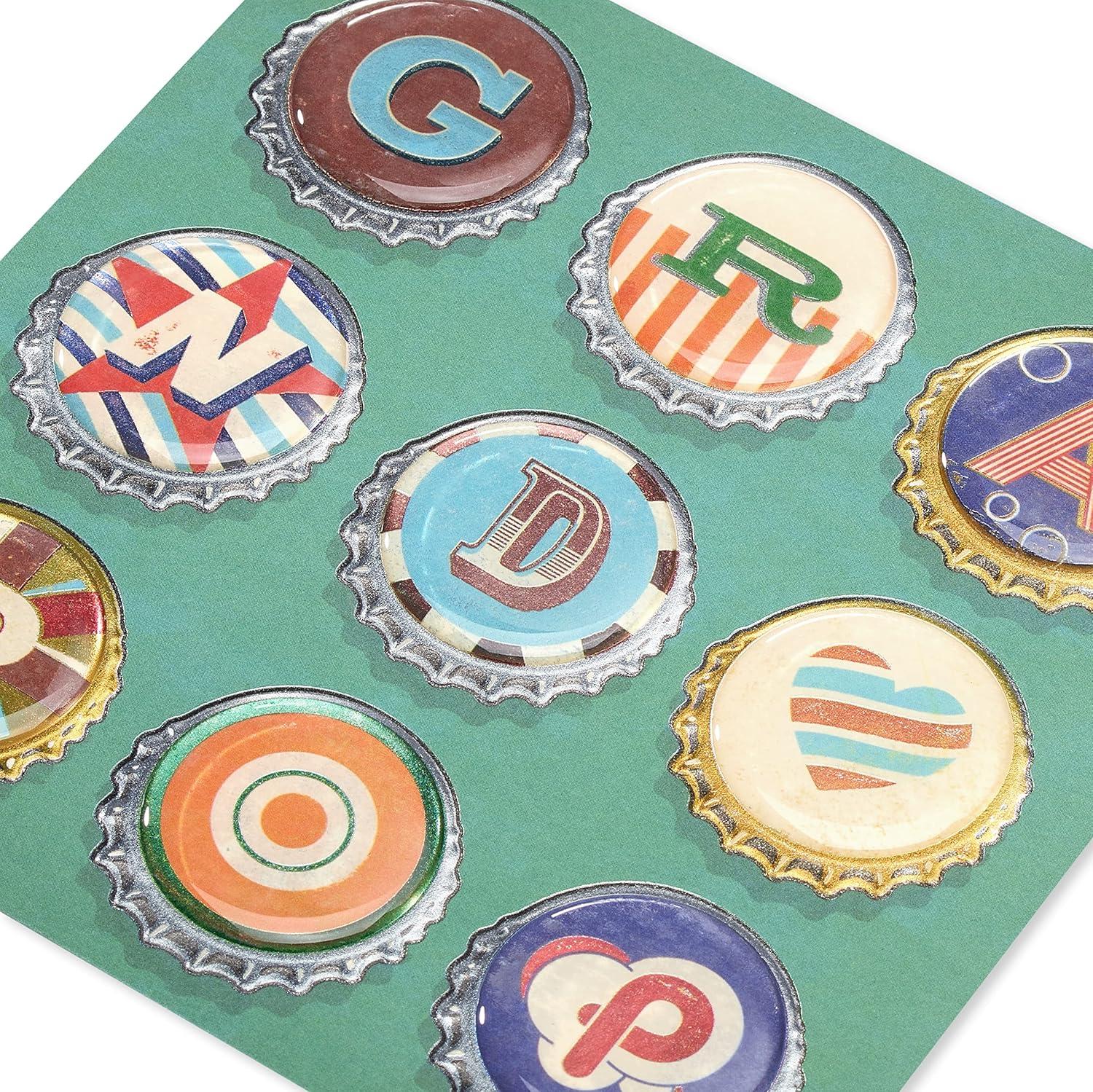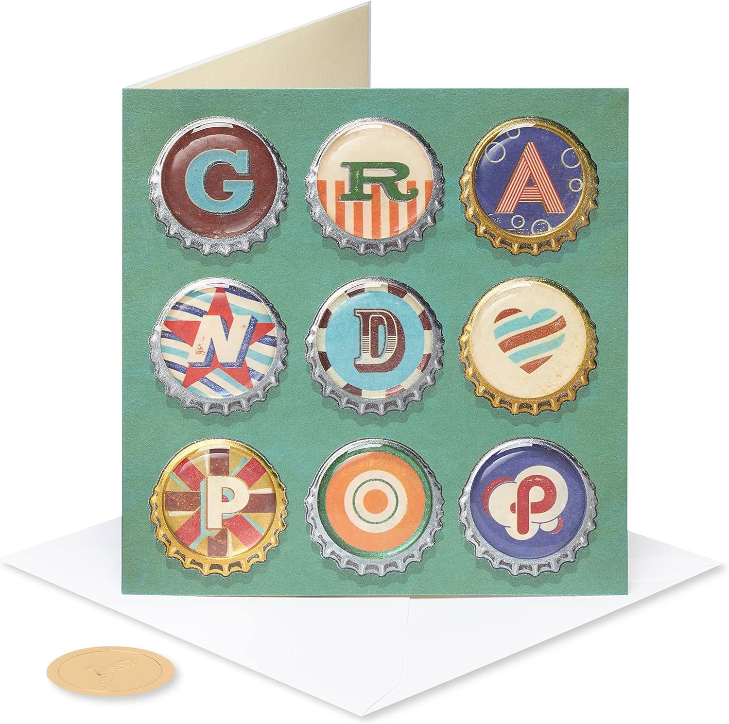 Bring some old school kind of cool to Grandpa’s Father’s Day with this premium Grandfather Father’s Day card, only from Papyrus! Illustrated design features a series of classic bottle caps, each featuring its own letter, laid out to spell the word “Grandpop.” Enhanced with embossing that helps the design stand out and further embellished with metallic foil and clear resin. Square shape adds artistic flair. Paired with a simple and warm inside message, this card will let your grandpop know how lucky you feel to have him in your life! A great way to put a smile on his face. Premium lined envelope and the unique Papyrus gold seal included. Extra postage required.