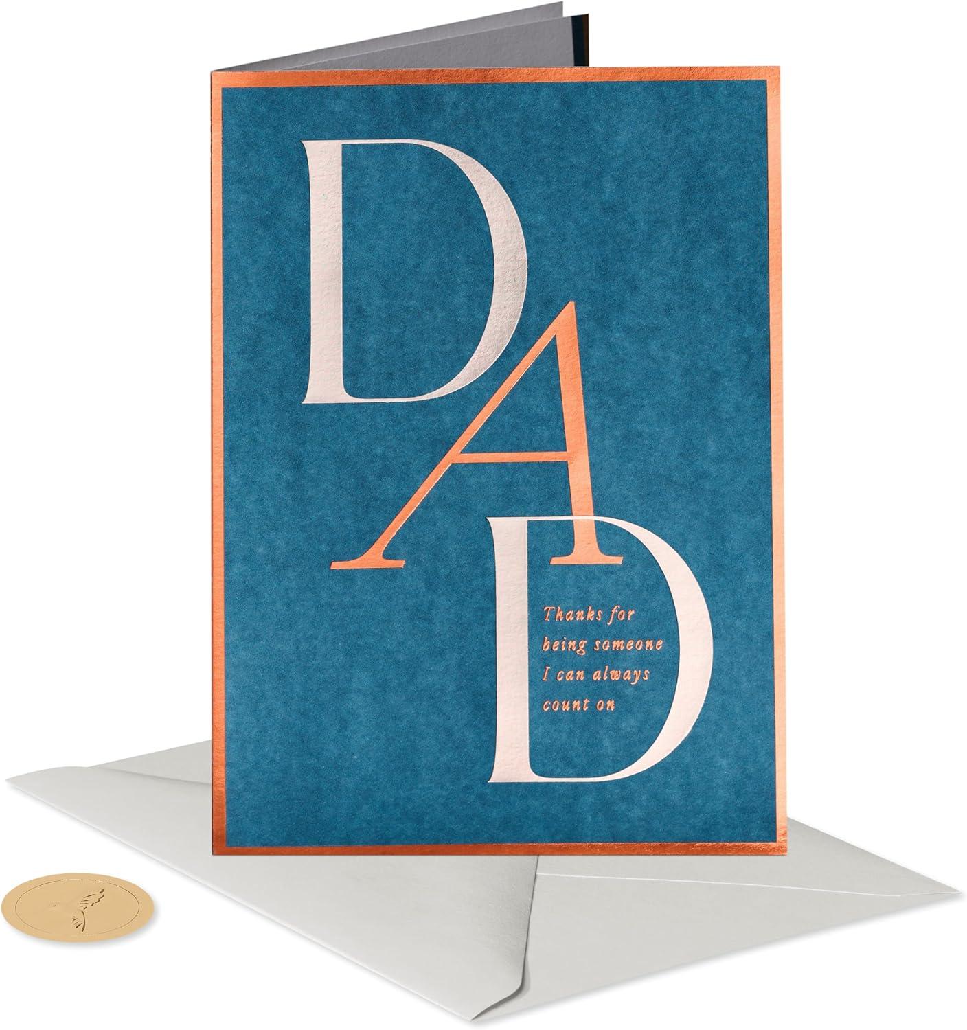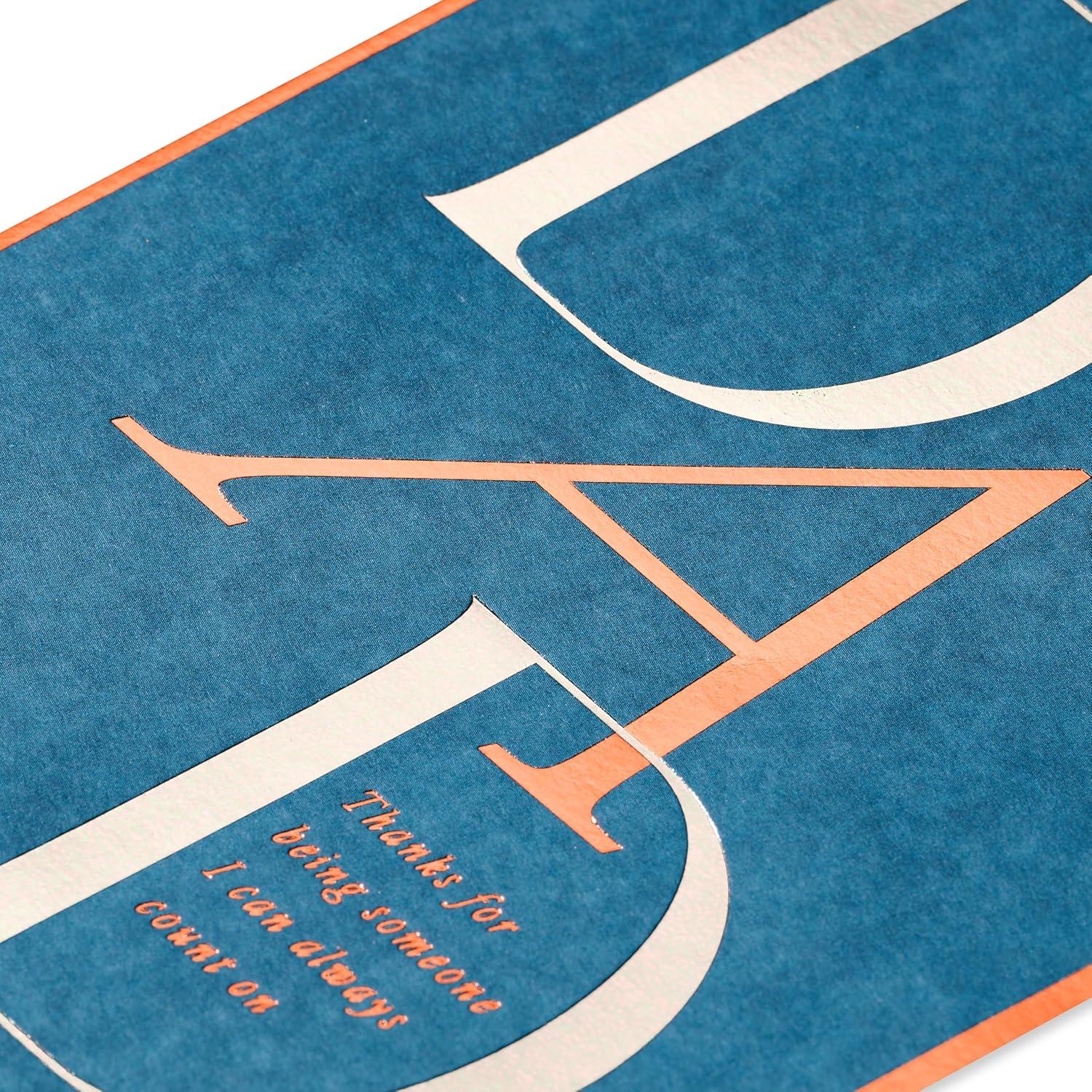 Express your deep gratitude this Father's Day with a sophisticated card from Papyrus. Exclusively designed, this card features 'DAD' in large, eye-catching letters against a deep blue background, highlighting the unwavering support he provides. Inside, a heartfelt message reminds him just how much he's appreciated. Perfect for celebrating your dad, husband, grandpa, or father-in-law, this card melds artistic design with emotional depth. Premium lined envelope with unique Papyrus gold seal included. Extra postage may be required. Only from Papyrus.