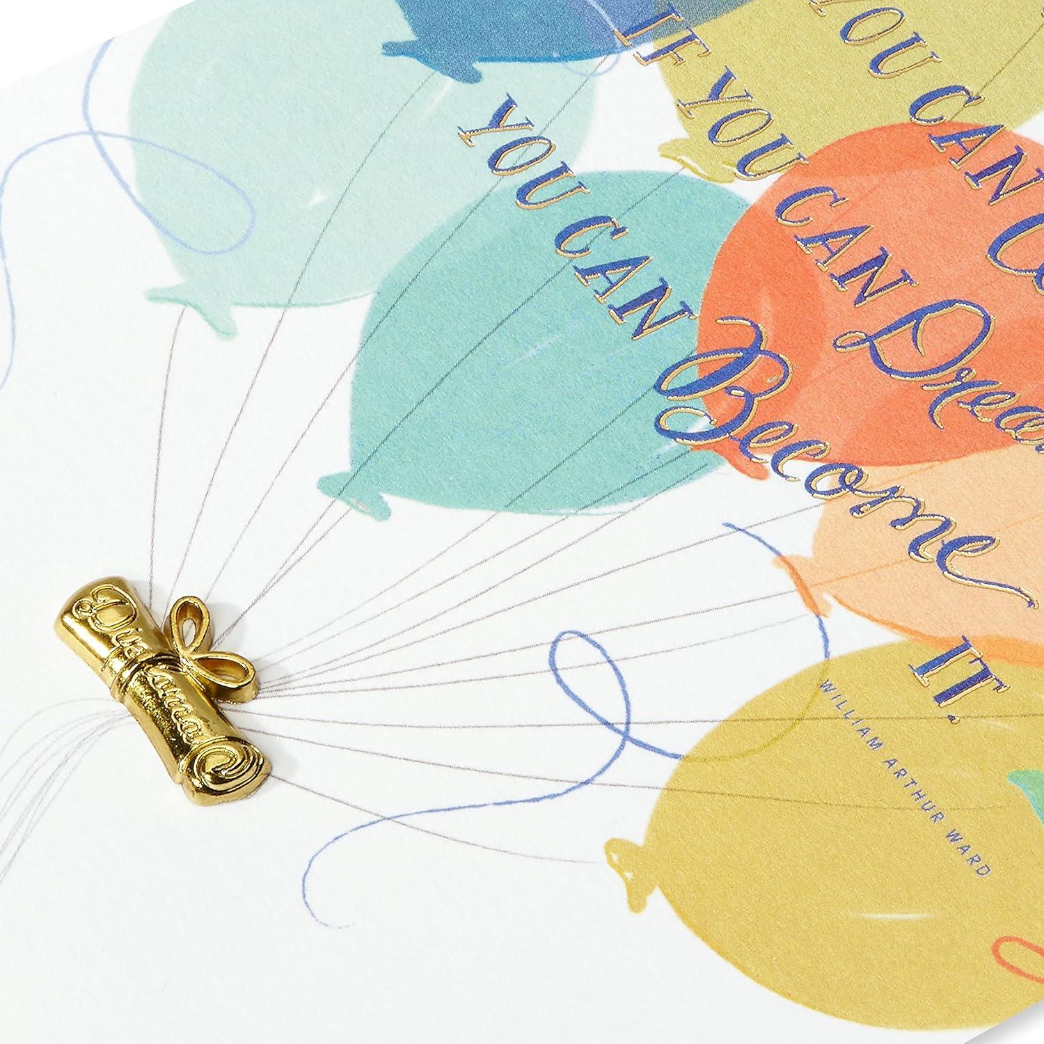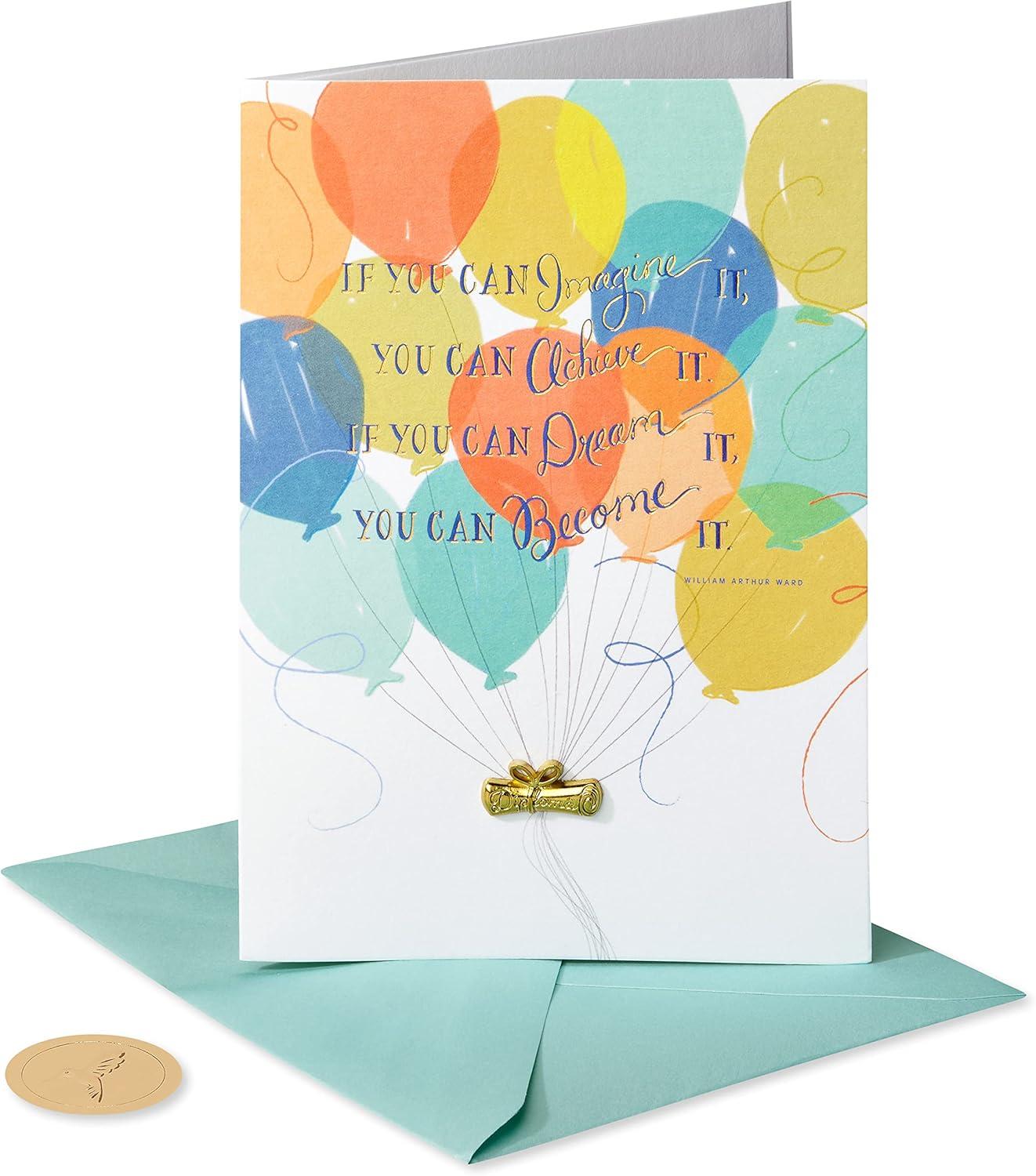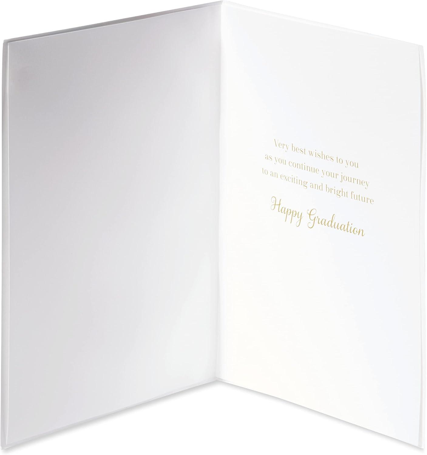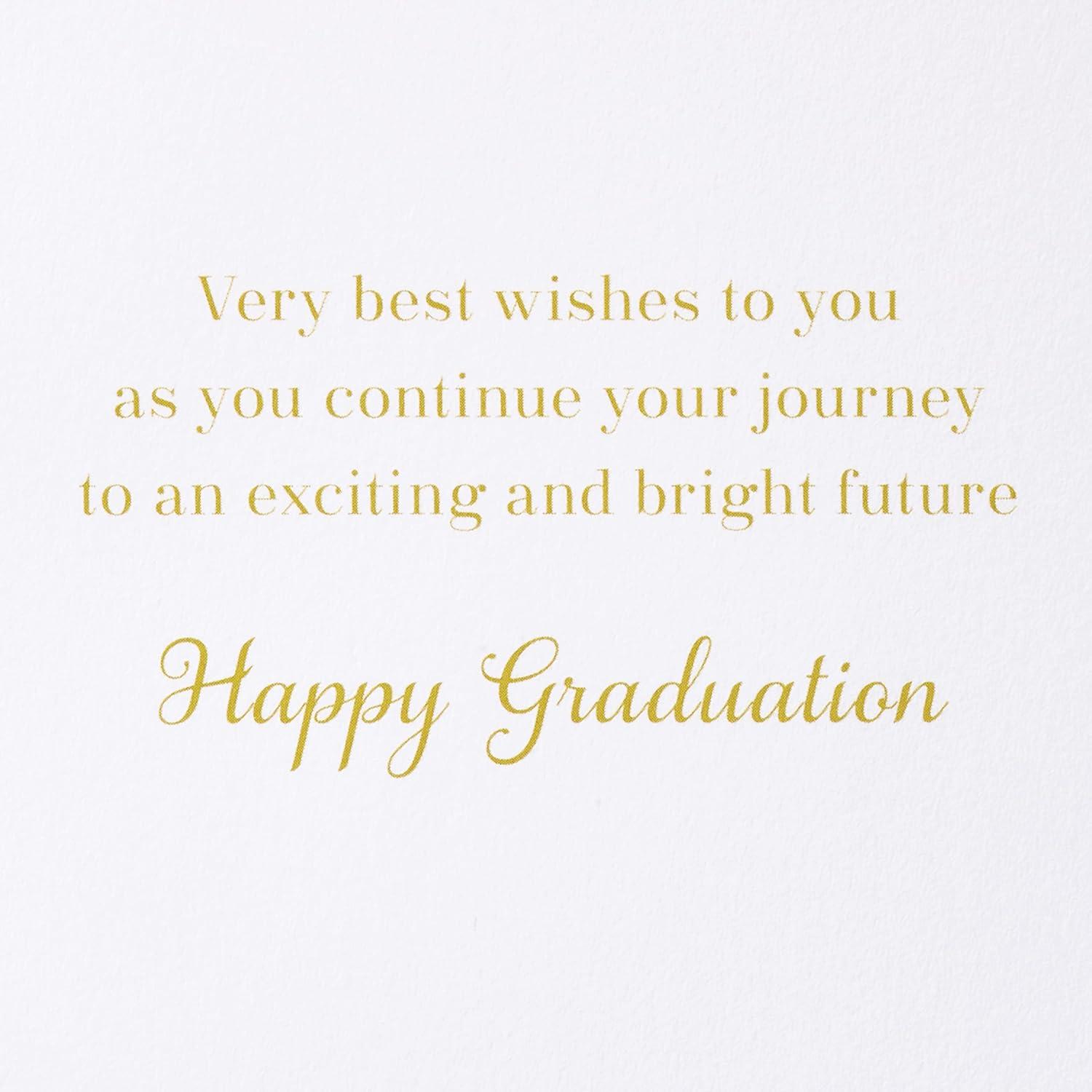 Show the graduate how proud and excited you are with a premium card from Papyrus. This timeless graduation card features a message in calligraphy that focuses on achievements, memories, and a bright future ahead, while the image of ivy hints at the importance of a good education. With premium handmade finishes such as a gold metal charm in the shape of a graduation cap, metallic foil, a blue ribbon, and high-quality paper stock, it’s a fitting way to say congratulations to any graduate. Includes blue envelope and gold seal. Extra postage is required.