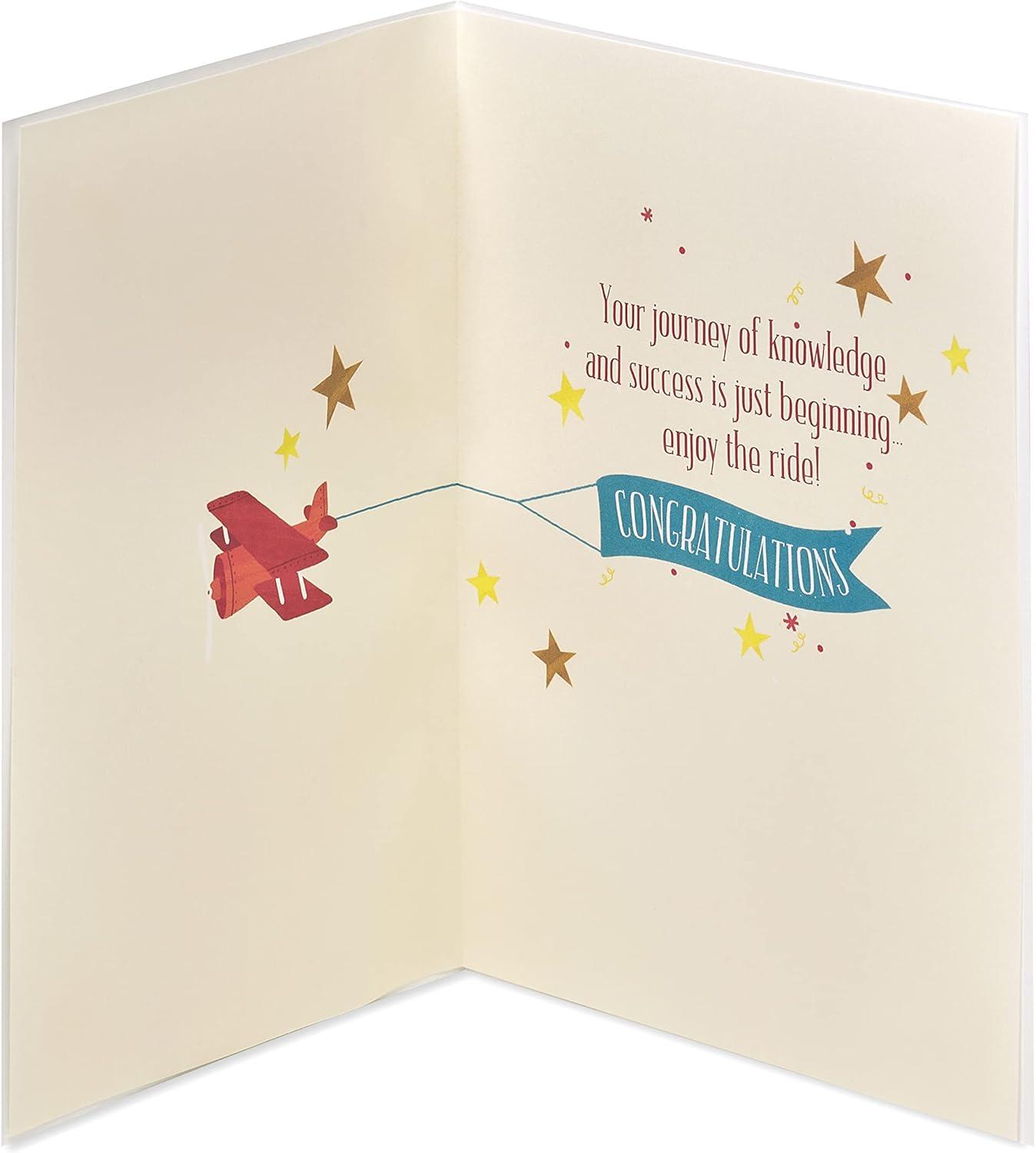 Show the graduate how proud and excited you are with a premium card from Papyrus. This timeless graduation card features a message in calligraphy that focuses on achievements, memories, and a bright future ahead, while the image of ivy hints at the importance of a good education. With premium handmade finishes such as a gold metal charm in the shape of a graduation cap, metallic foil, a blue ribbon, and high-quality paper stock, it’s a fitting way to say congratulations to any graduate. Includes blue envelope and gold seal. Extra postage is required.