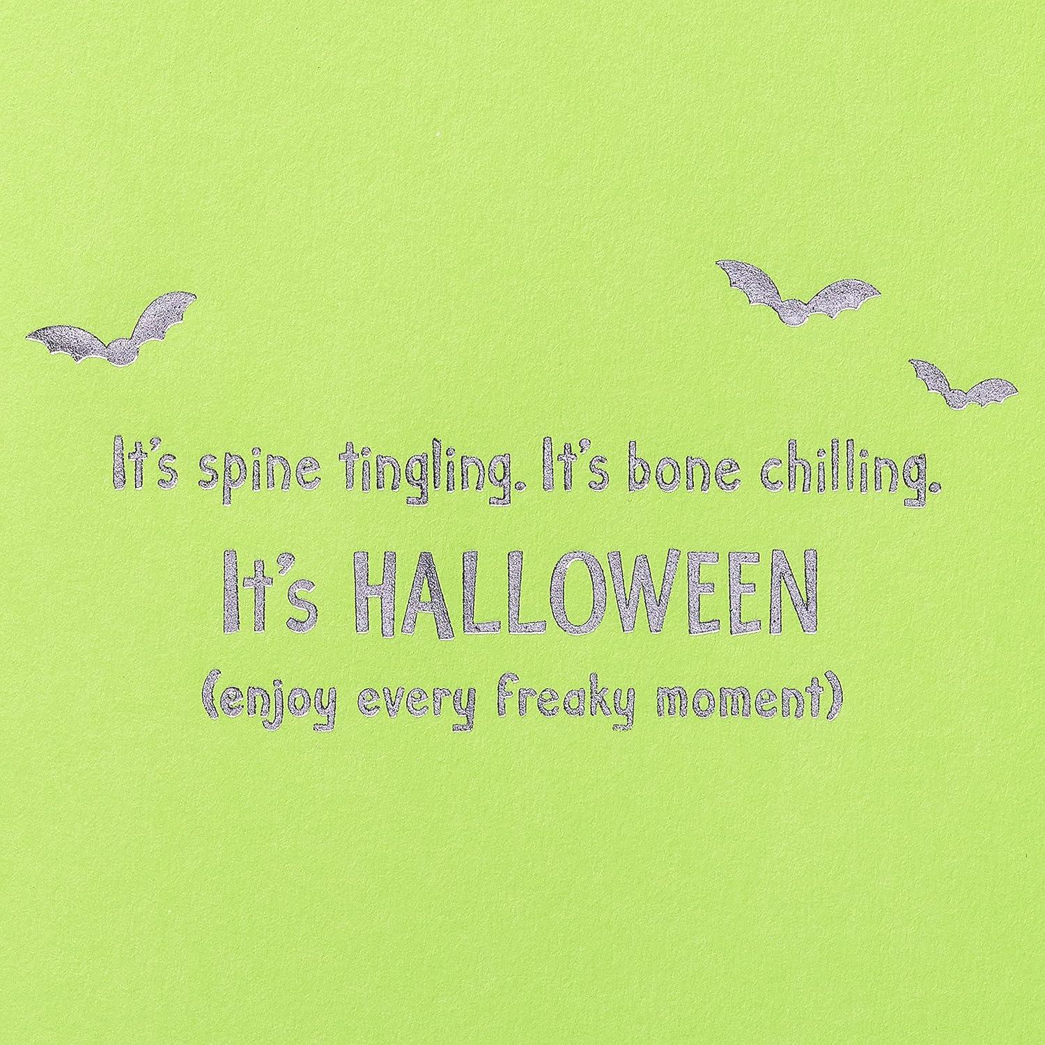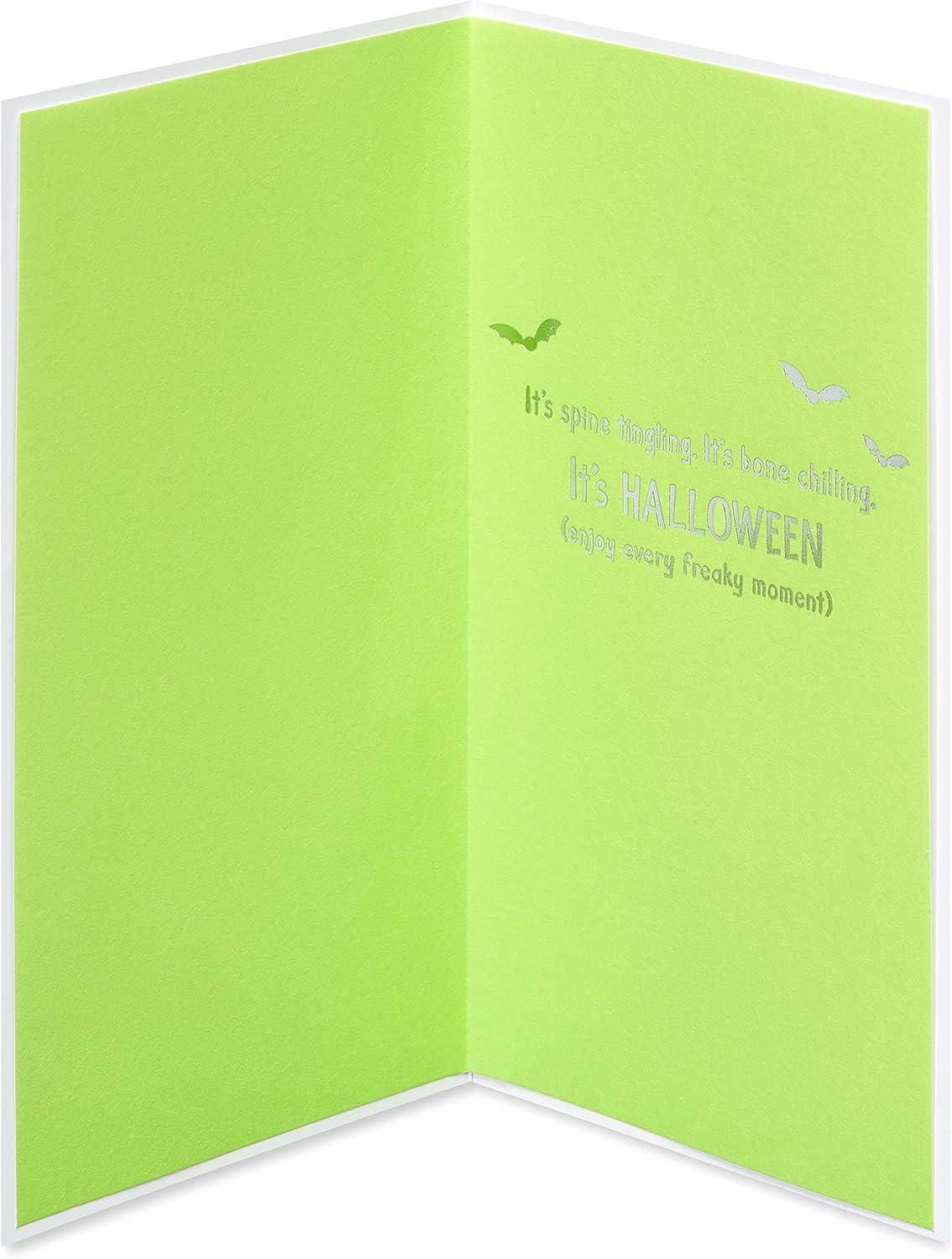 The Halloween fun just got even better! This totally “booo-nique” card from Papyrus is a delight for any fan of season! Featuring a large felt pumpkin filled to the brim with traditional Halloween treats (and a few tricks!), the card can be quickly and easily turned into a cool mobile to hang using the attached ribbon! Bright, festive, and fun for kids of all ages, this premium card is guaranteed to get them in the Halloween spirit! Comes with matching green envelope with fun liner pattern. Extra postage may be required.