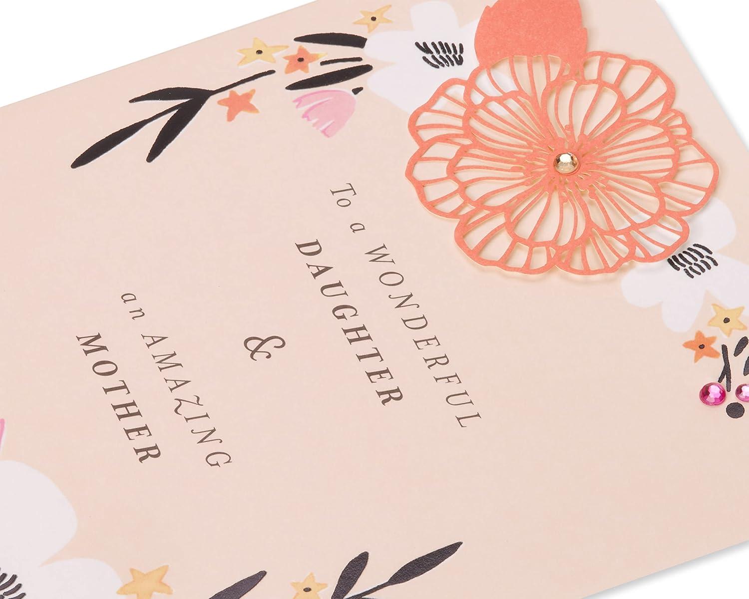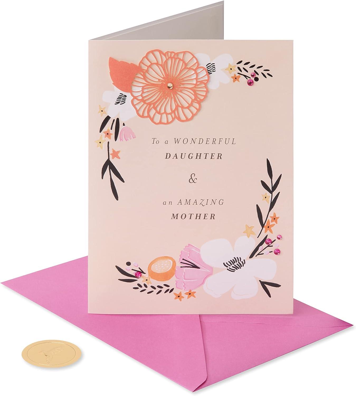 Daughters grow up to be some of the best mothers. Recognize your daughter with a gorgeous Mother’s Day card from Papyrus. This premium card features a beautiful message accented by metallic foil, glitter, gems, delicate paper art, and layered attachments on a pale pink background. The floral design and message are elegant, expressive and from the heart. Let her feel loved and seen with a card from Papyrus. Coordinating lined envelope and golden seal are included. Requires extra postage.