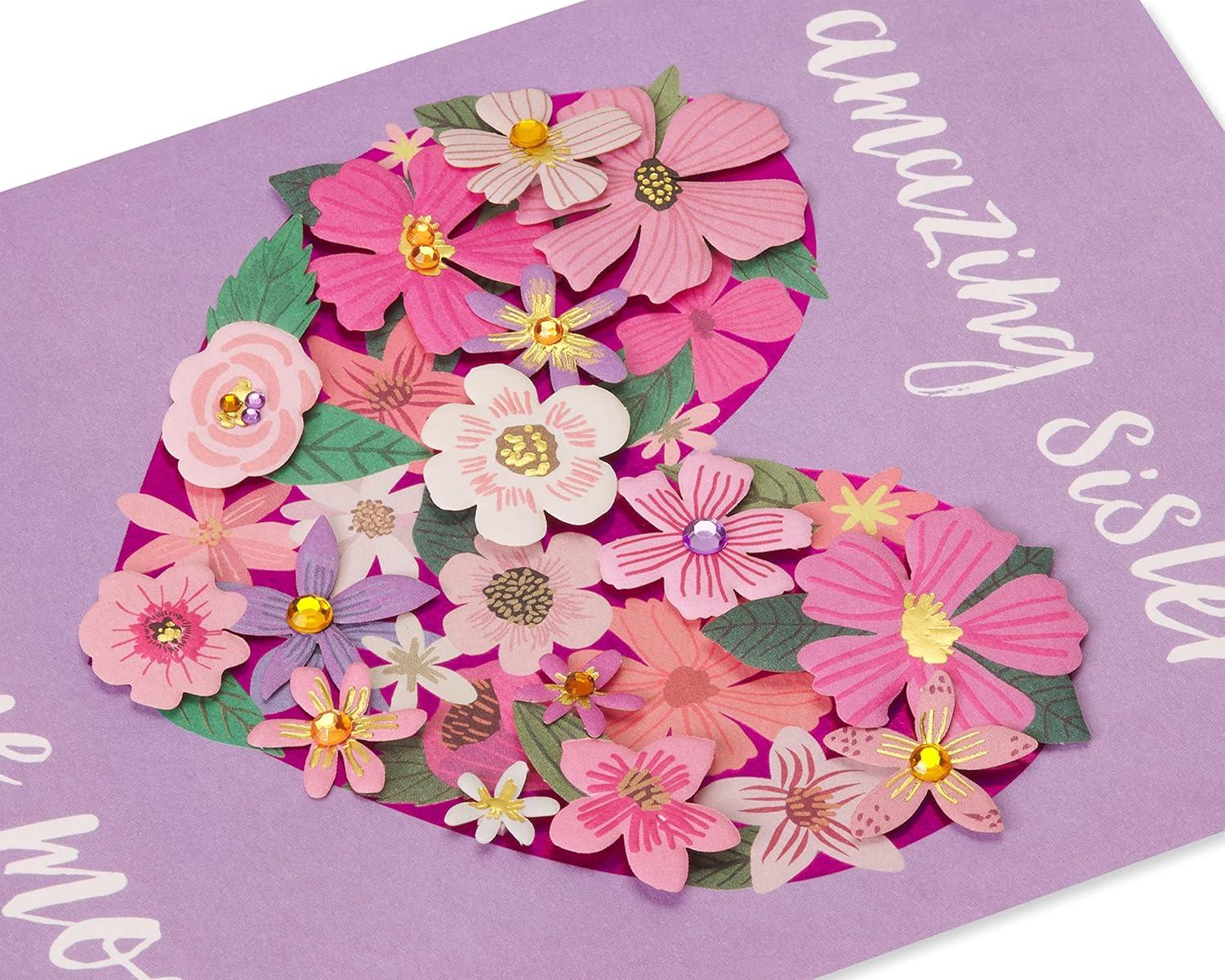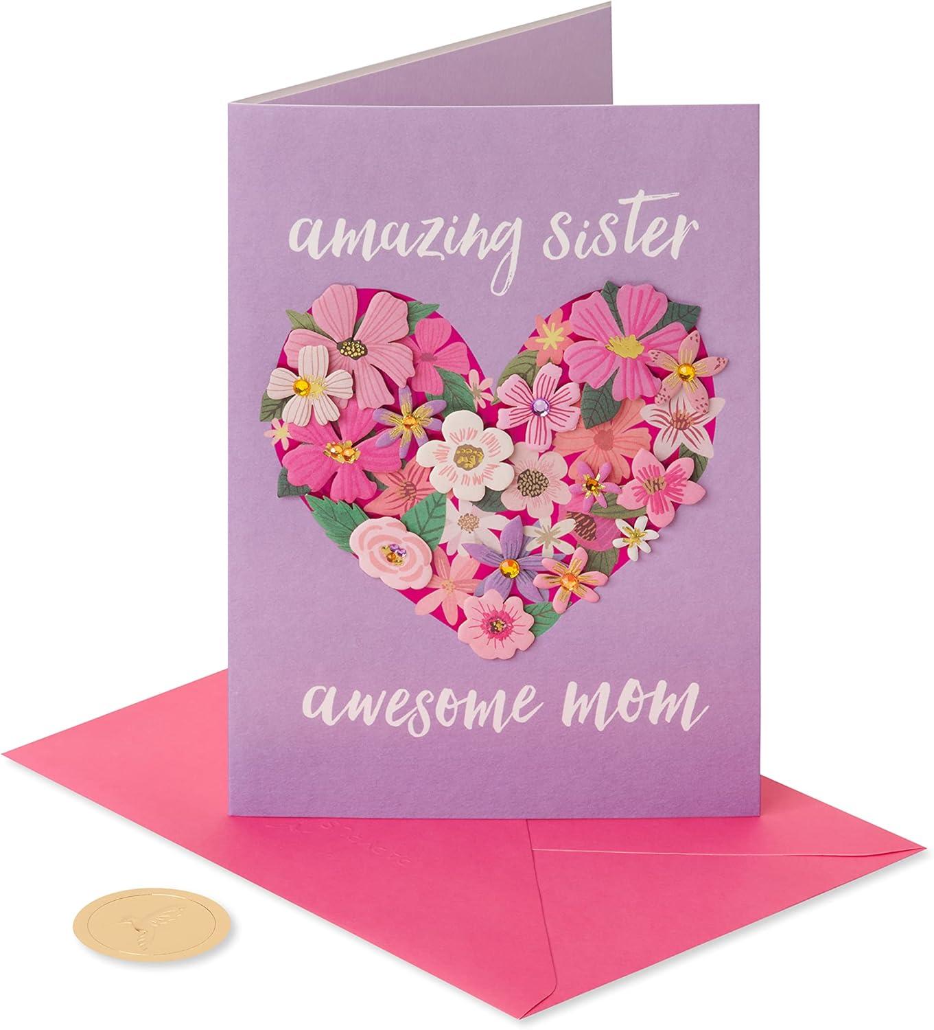 Show your sister some love on Mother’s Day with a beautiful card from Papyrus. This card features a heart made of lush and colorful florals on a purple background. With embellishments like glitter, gems, metallic foil, and layered paper attachments, plus a message with a warm compliment, she’s bound to feel special. Give her your best with a card from Papyrus. Includes lined envelope and gold seal. Extra postage is required.