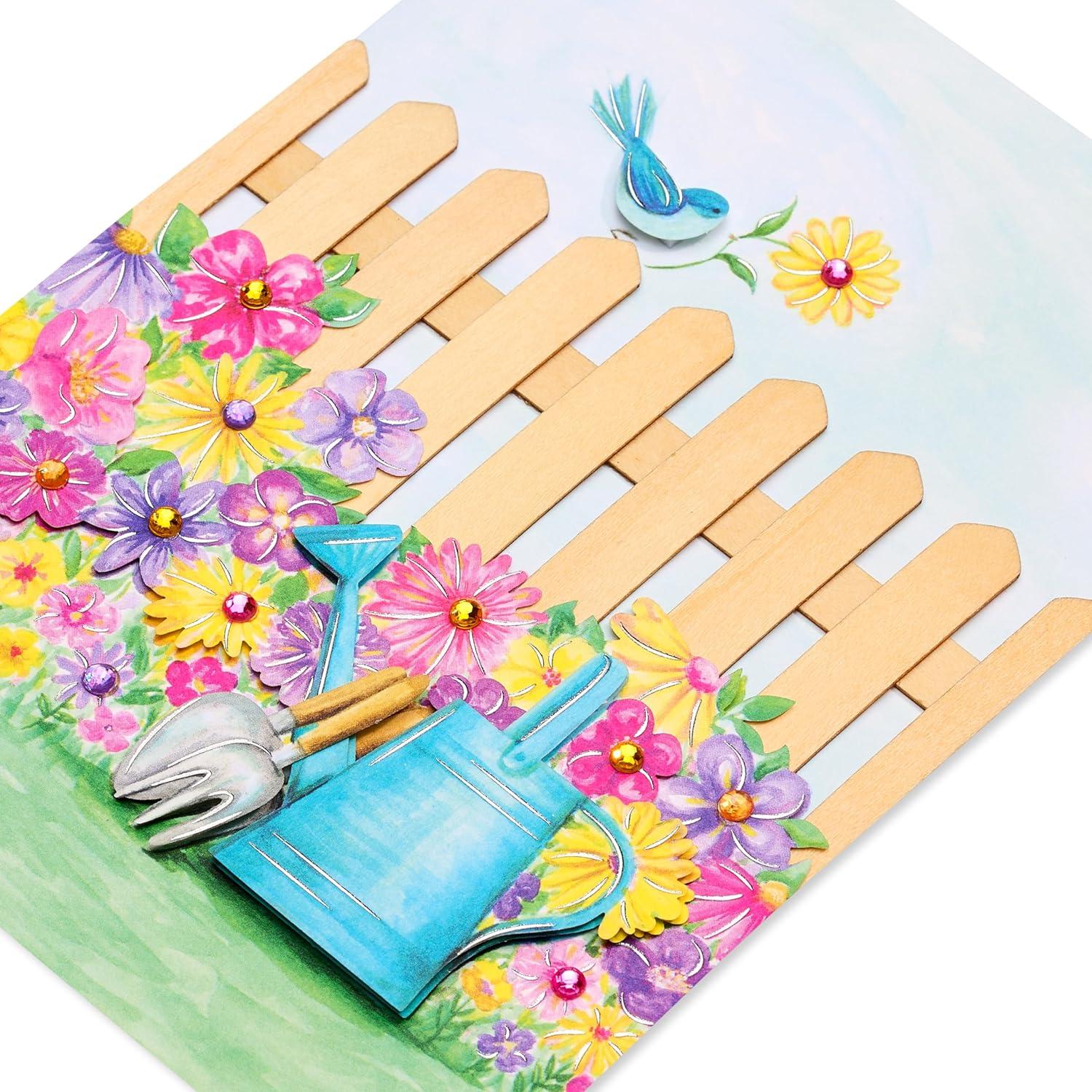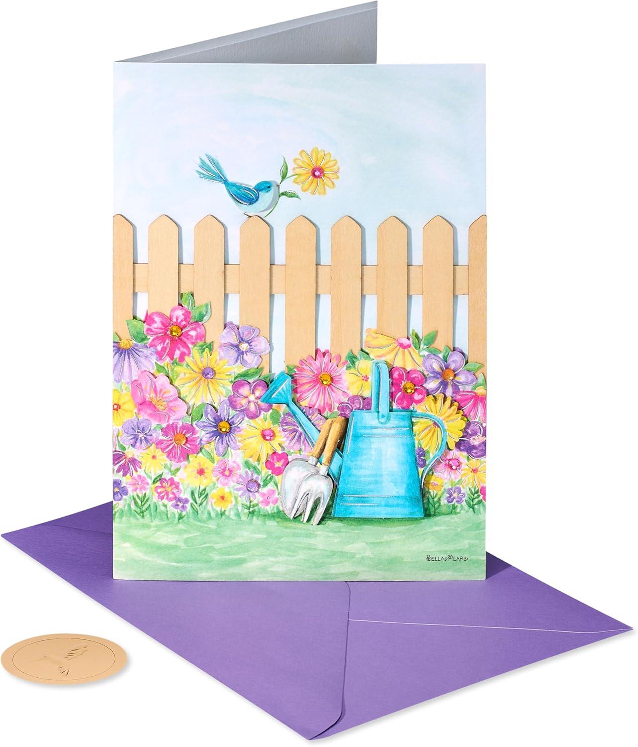 Send a garden of greetings to any special mother with this premium Mother’s Day card from Papyrus! Perfect for your own mom, stepmom, or any mother you know! This premium design by Bella Pilar features a bluebird of happiness bringing joy to a lush, colorful garden that’s surrounded by a real wood fence! Flowers are embellished with gems and shimmering metallic foils, with layered paper attachments bringing this garden to life. Warm wish inside invites her to spend her special day doing the things she loves. You’re sure to make her smile with this premium Mother’s Day Card! Premium purple envelope with flower-patterned lining and unique Papyrus seal are included. Extra postage may be required. Only from Papyrus.