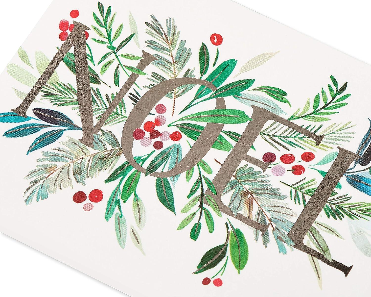 Send warm and cheery holiday wishes with this lighthearted Papyrus card featuring “NOEL” embellished in silver foil a top beautifully detailed holly . Set of 20 cards comes with coordinating envelopes, gold Papyrus hummingbird seals and a box with acetate lid. Papyrus offers premium stationery, greetings cards, gift wrap, gift bags and entertaining products for everyday occasions and all holiday seasons-all with unique designs and quality embellishments.