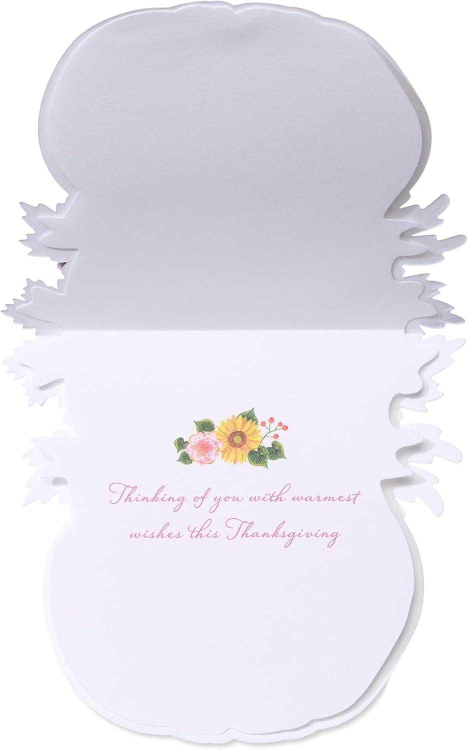 Let them know you’re thinking about them this Thanksgiving with this Premium Thanksgiving card from Papyrus. This exquisite laser-cut design is in the shape of a pumpkin and accented by a fall color palette. The craftmanship of the card is further enhanced with embossing and layered paper attachments of acorns and a maple leaf. With a simple and heartfelt message, they’ll certainly feel grateful for you this Thanksgiving. Premium envelope with unique Papyrus gold seal included. Extra postage required.