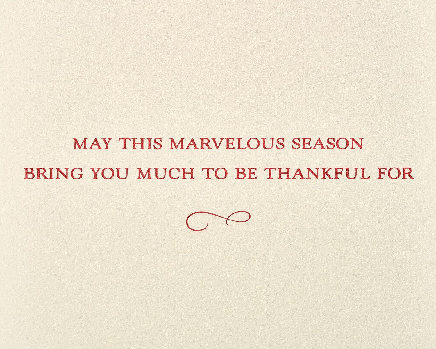 Let them know you’re thinking about them this Thanksgiving with this Premium Thanksgiving card from Papyrus. This exquisite laser-cut design is in the shape of a pumpkin and accented by a fall color palette. The craftmanship of the card is further enhanced with embossing and layered paper attachments of acorns and a maple leaf. With a simple and heartfelt message, they’ll certainly feel grateful for you this Thanksgiving. Premium envelope with unique Papyrus gold seal included. Extra postage required.