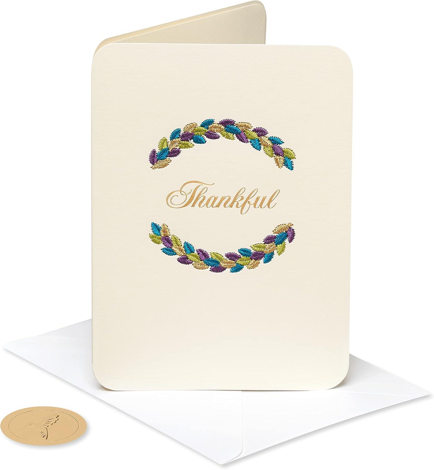 Let someone far away know they’re still close to your heart during the holidays with this premium Thanksgiving card from Papyrus. The front features a beautifully ornate fall design with a turkey and is accented with, glitter, gold foil, raised elements, and dark red, amber, and champagne-colored gems. The inside includes a warm wish that’s sure to send smiles across the miles. Includes envelope with coordinated design and gold seal. Extra postage may be required.