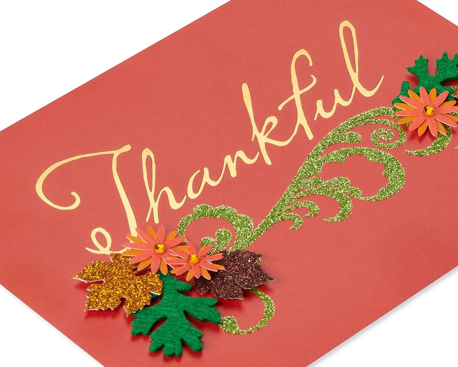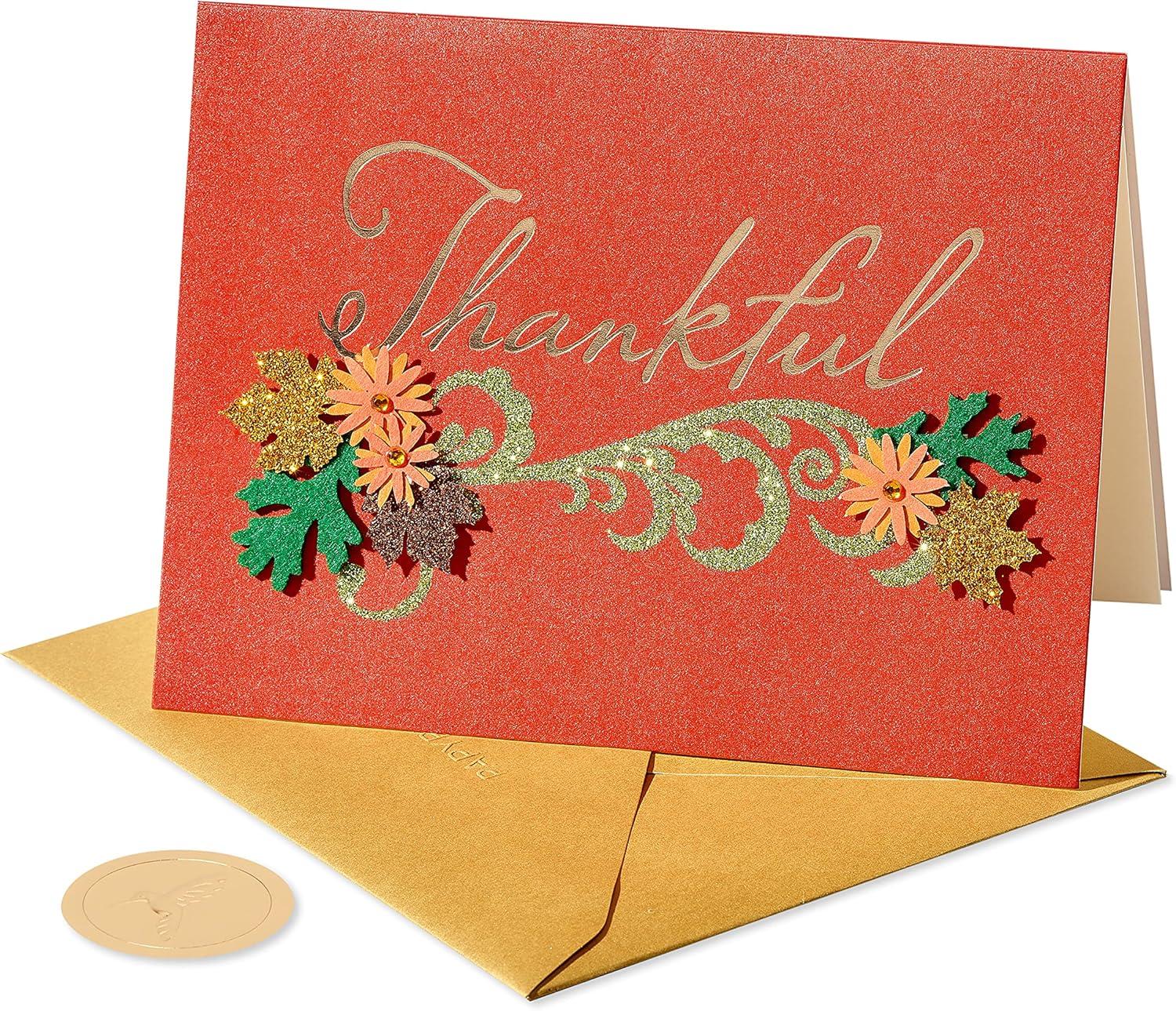 Give thanks to the important people in your life with this beautiful Thanksgiving card from Papyrus. The card features a simple but elegant floral design in traditional fall colors, with a large “Thankful” spelled out in script. Extra embellishments include gold metallic foil, green glitter, and floral paper attachments. Bring a smile to those closest to you with this heartfelt and unique design, only from Papyrus! Matching gold envelope and gold foil seal included. Extra postage may be required.