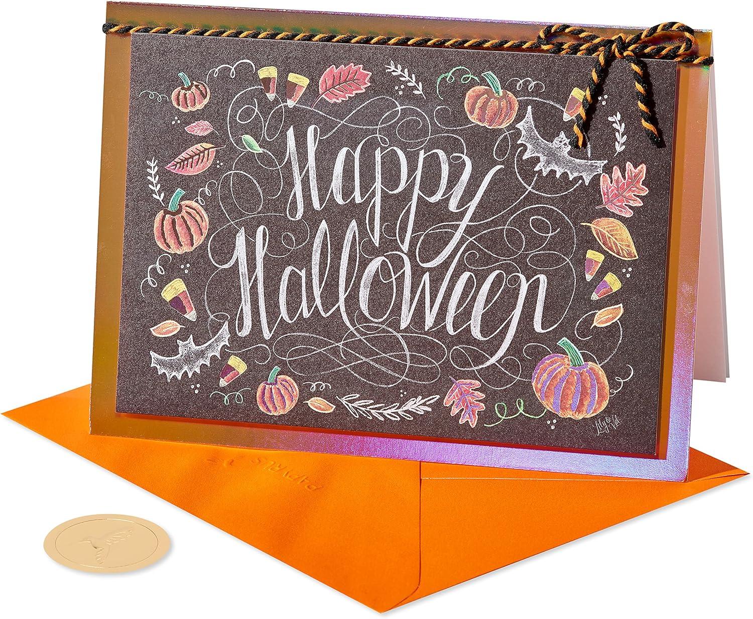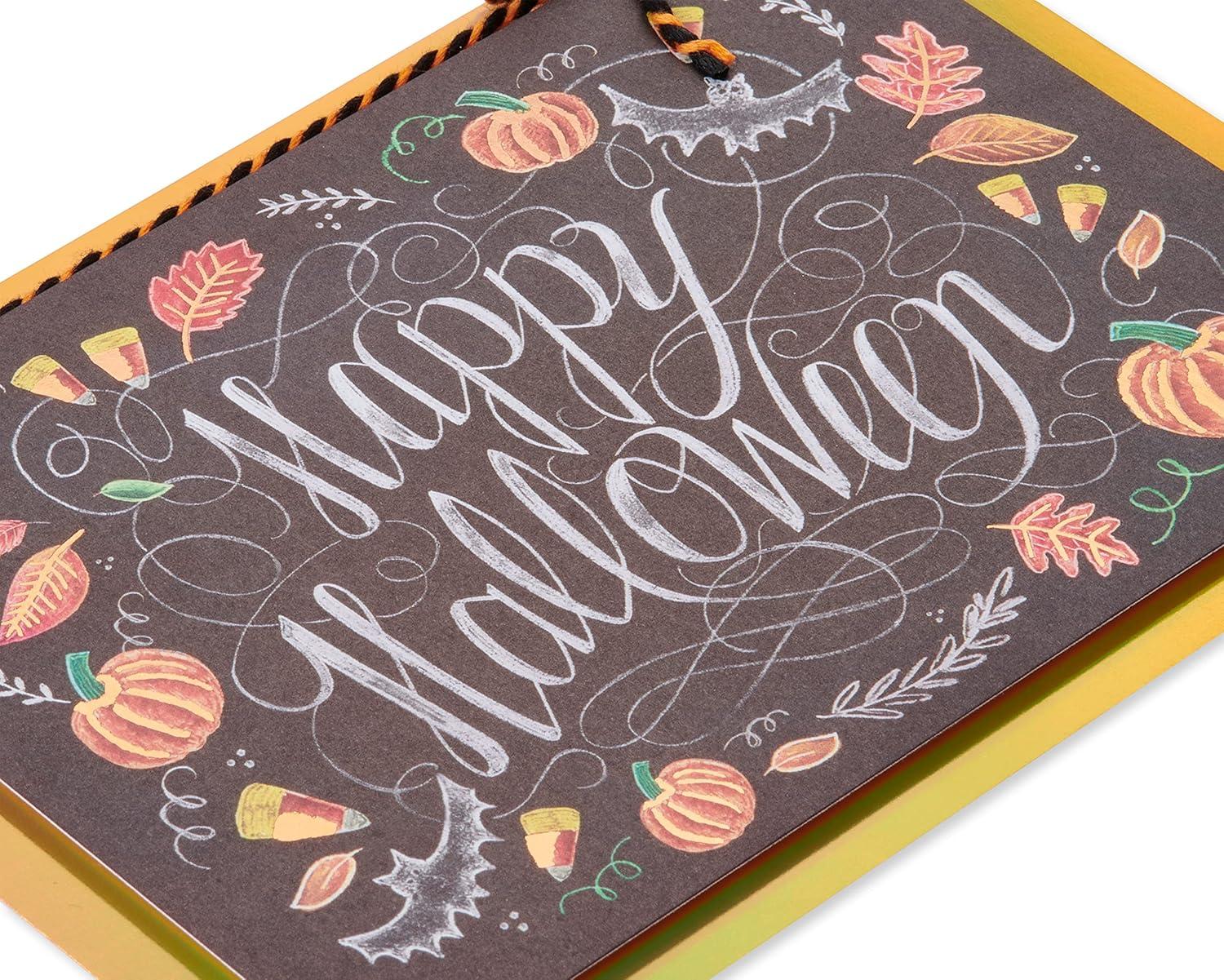 Wish them a wonderfully spooky day with this hand lettered premium Halloween card from Papyrus! Design uses the chalkboard style in a magical hand lettered script, surrounded by a colorful autumn border of candy corn, bats, and pumpkins, and embellished with metallic orange foil. Fun wish inside will get them in a Halloween mood! Perfect for any Halloween lover in your life, like friend, family, child, son, daughter, grandson, granddaughter, niece, nephew, teacher, student, coworker, neighbor, and more. Includes an orange envelope and unique Papyrus gold seal. Extra postage may be required.